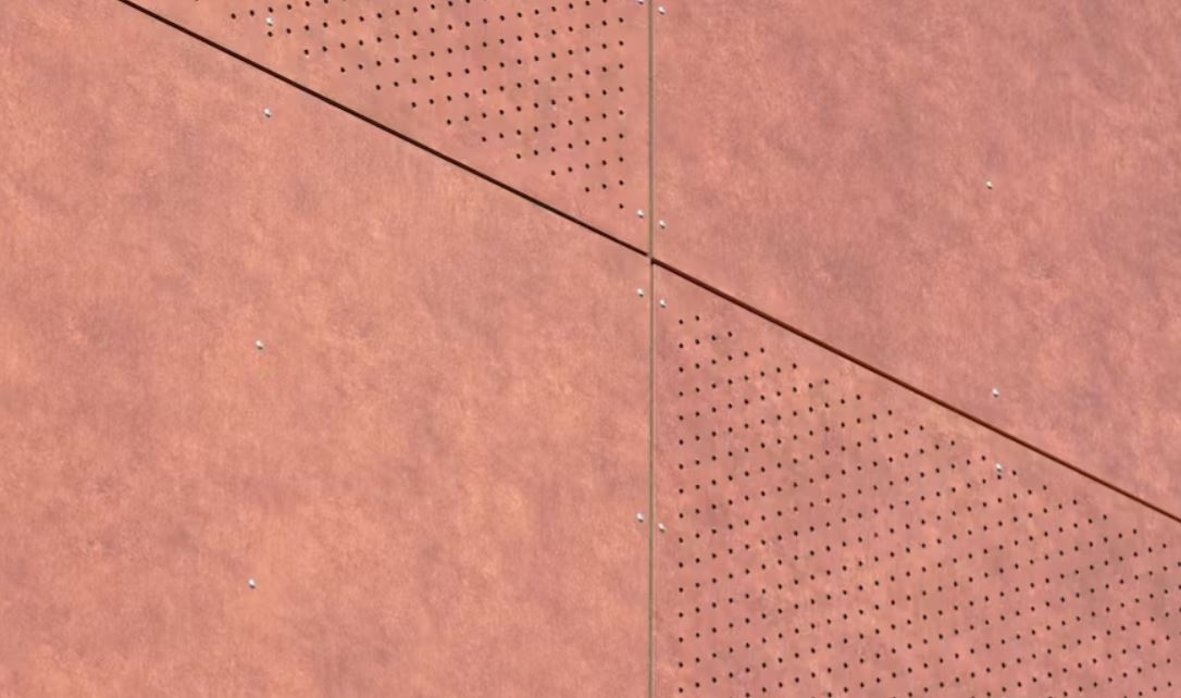 « Alors que les parties inférieures de l’usine de traitement de l’eau arborent un aspect béton avec des teintes complètement sombres, la couleur rouille permet de jouer avec la hauteur. En outre, la partie de couleur rouille, qui rappelle l’acier corten, est rehaussée par des perforations. »