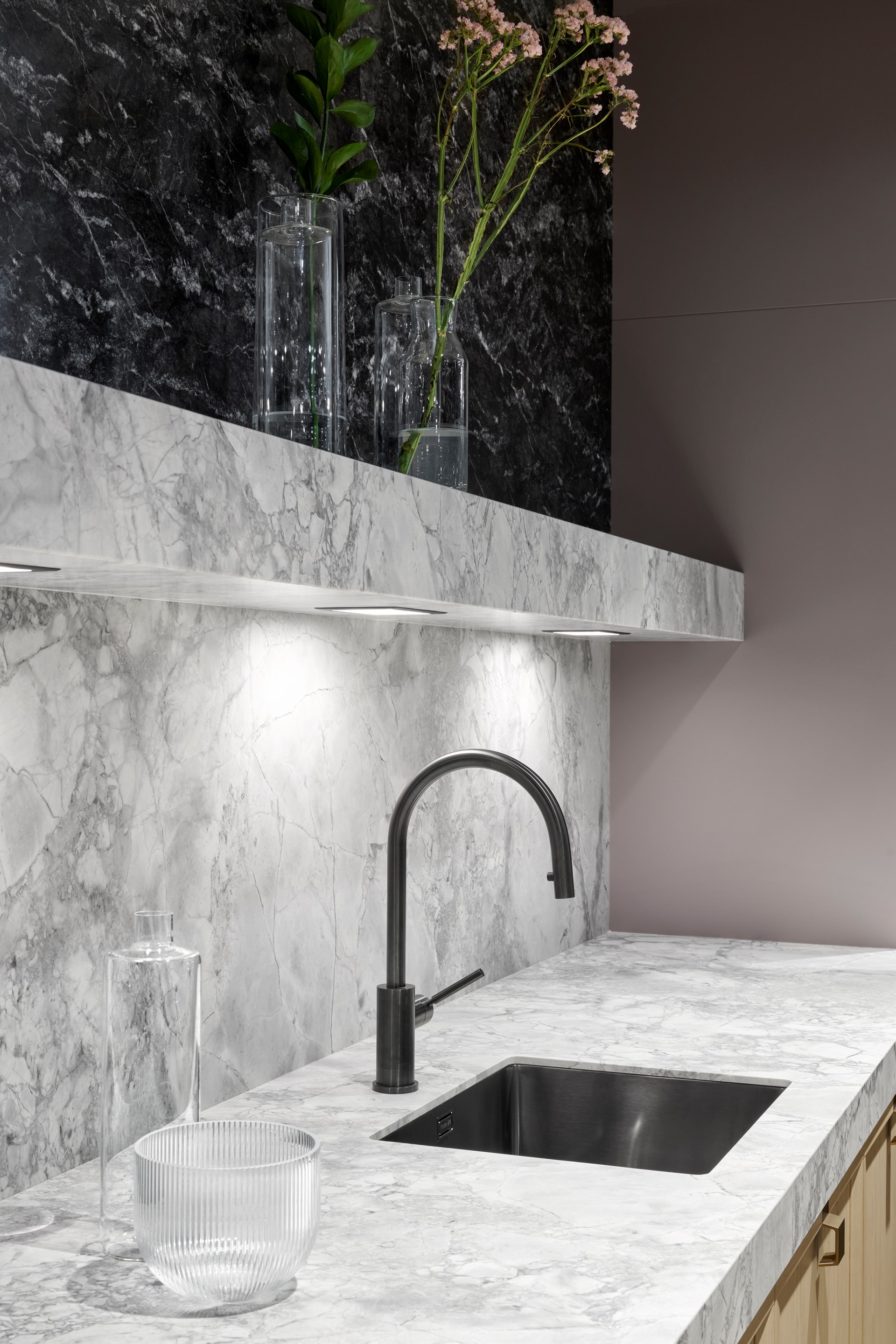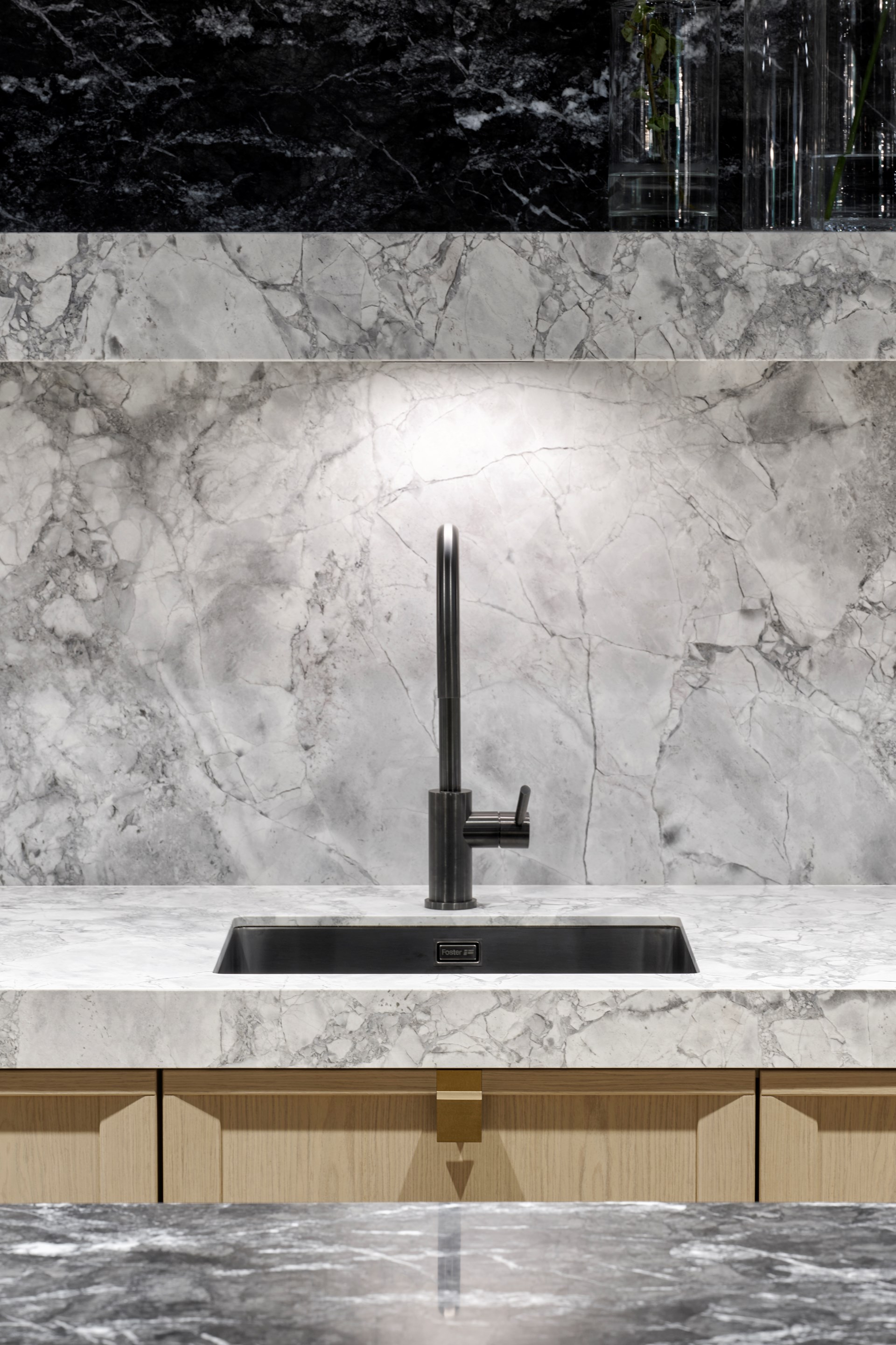 Les combinaisons des couleurs et des matériaux se retrouvent également dans les éléments de la cuisine, comme l'îlot. Ils confèrent aux équipements une nuance à la fois minimaliste et accueillante. Les formes géométriques de base sont parfaitement équilibrées avec des touches raffinées et des éléments robustes dominants.