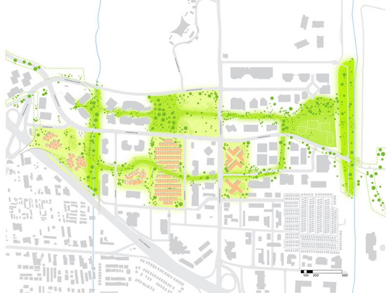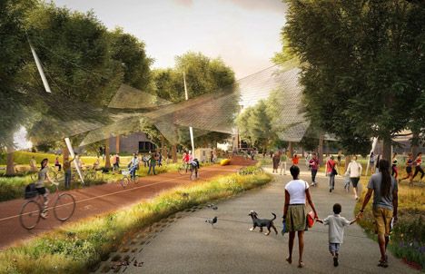 BIG et Heatherwick Studio ont imaginé 'Google's Mountain View' en Californie. Le plan propose un redéploiement et une extension du siège principal au moyen d'une série de structures légères en forme d'auvent. Le nouveau complexe s'organise autour et au sein d'un paysage flexible de pistes cyclables et opportunités commerciales pour les entreprises locales.