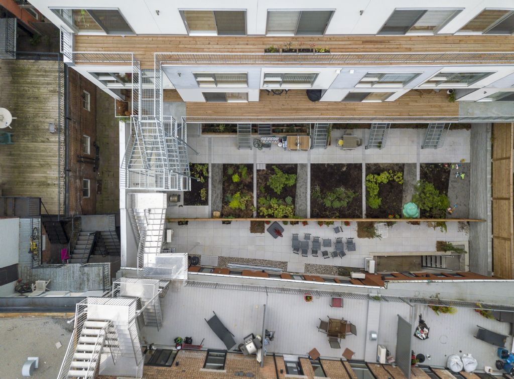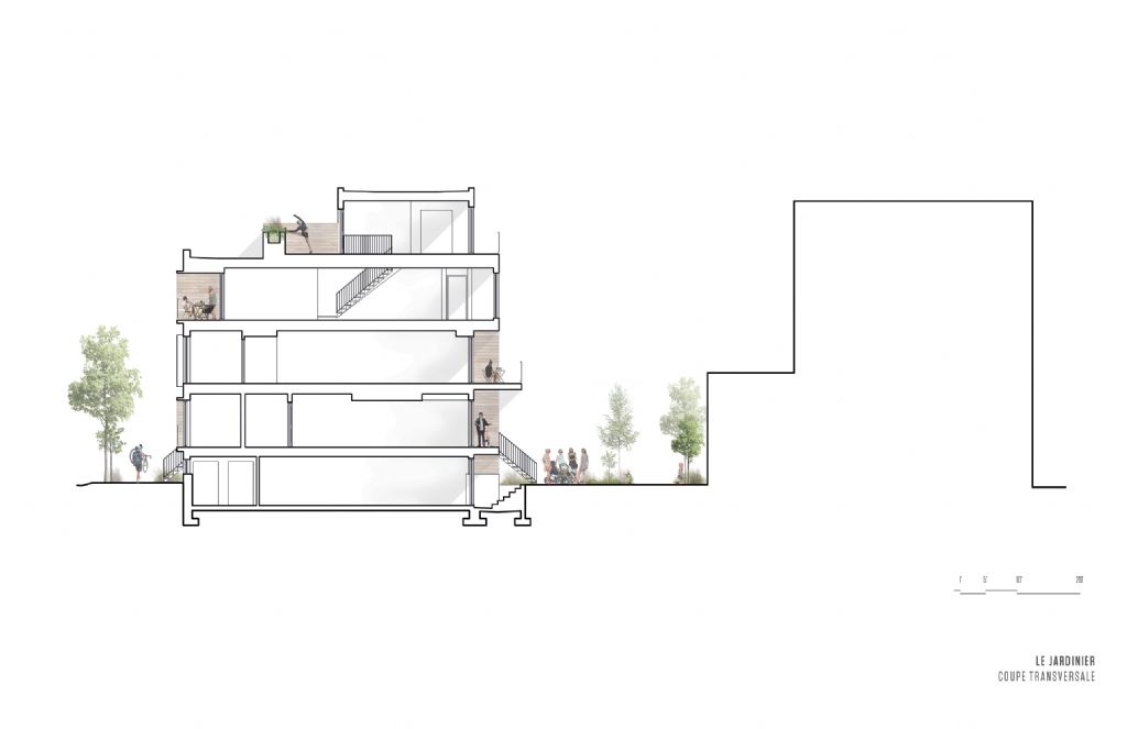 L’idée de créer un havre de paix pour ses habitants, d’offrir un lieu de partage et répondre aux besoins d’une société de plus en plus proche de son environnement fut également au cœur de la réflexion dans le projet du Jardinier. En découle une grande place laissée à la verdure. Situation assez rare à Hochelaga, de même qu’à Montréal en général, la cour intérieure a été complètement aménagée pour créer des jardins et potagers. Le jardinage étant l’un des principal passe-temps des Québécois, des lopins de terres composés essentiellement de végétaux comestibles sont intégrés à la cour. Les terrasses du dernier étage sont également disposées à accueillir un peu de nature grâce notamment aux garde-corps qui jouent un double rôle, car ils sont également des bacs pour plantations. Toujours dans cette dynamique environnementale, le projet souhaite encourager les transports actifs et alternatifs, en intégrant des stationnements à vélo dans la porte cochère ainsi qu’un garage pour voiture Communauto, accessible à tous les résidents.
