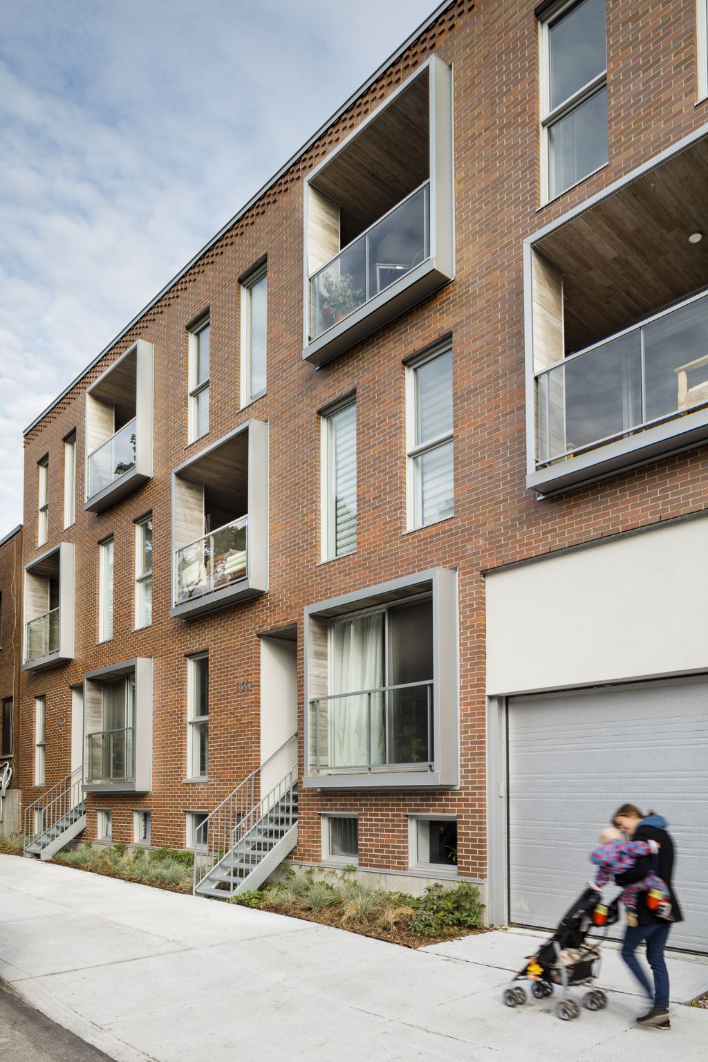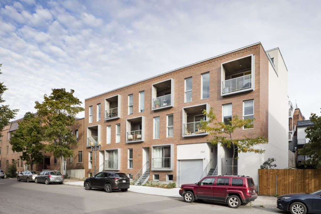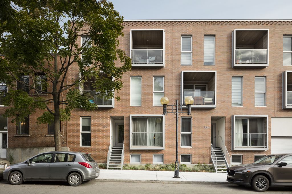 Malgré la modernité de ces éléments, la façade avant reste sobre et parfaitement intégrée au contexte urbain et historique. La teinte de la brique rappelle celle de la majorité du secteur, tout comme le gabarit général du bâtiment. Le motif du damier, très présent sur les bâtiments patrimoniaux de la rue, est repris sur la façade, allant du jeu de briques de la corniche jusqu'à l'alternance des loggias à l'avant et des différents parements à l'arrière. Enfin, les escaliers donnant accès aux logements avec leur structure métallique légère font référence aux escaliers typiques de Montréal.