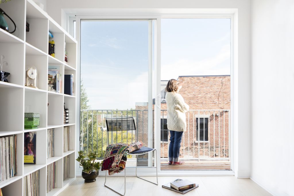 Guidé par une idée dominante d’ouverture, le bâtiment a été conçu de sorte à ce que chaque logement soit traversant. Ainsi toutes les unités bénéficient d’une ouverture à l’arrière comme à l’avant, avec une loggia d’un côté ou de l’autre. La disposition de ces appartements offre alors, en façade comme sur la cour, un agréable dynamisme grâce à un jeu de décalage en plan des unités. Ces loggias permettent, en fin de compte, la création d’espaces privés et isolées acoustiquement les uns des autres, tels des cocons à la fois intime et aérés. A l’intérieur, la qualité des appartements va bénéficier de cette pensée fondatrice, puisque cette transversalité permet aux résidents de bénéficier d’une luminosité constante tout au long de la journée. Les unités du dernier étage, quant à elles, disposent d’une mezzanine donnant sur des terrasses dont l’horizon dégagé offre une vue imprenable jusqu’au pont Jacques Cartier.