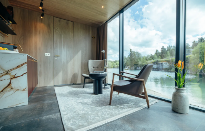 L'intérieur de la Golden House se distingue par des matériaux soigneusement sélectionnés. En collaboration avec la société britannique de design Buster & Punch, les créateurs ont opté pour des accents dorés dans les poignées, interrupteurs et luminaires. Les panneaux muraux en chêne, patinés à l’or, et les bordures dorées qui ornent les plafonds apportent une sophistication subtile et élégante.
