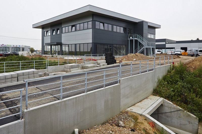 L’entrepreneur avait aussi en charge les aménagements extérieurs et l’égouttage. Deux bassins d’orage ont été créés sous le parking, d’une capacité respective de 400 m3 et 150 m3.
