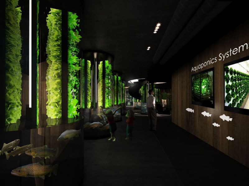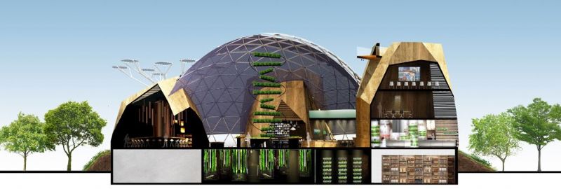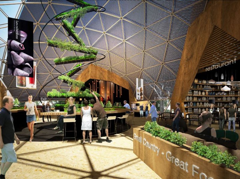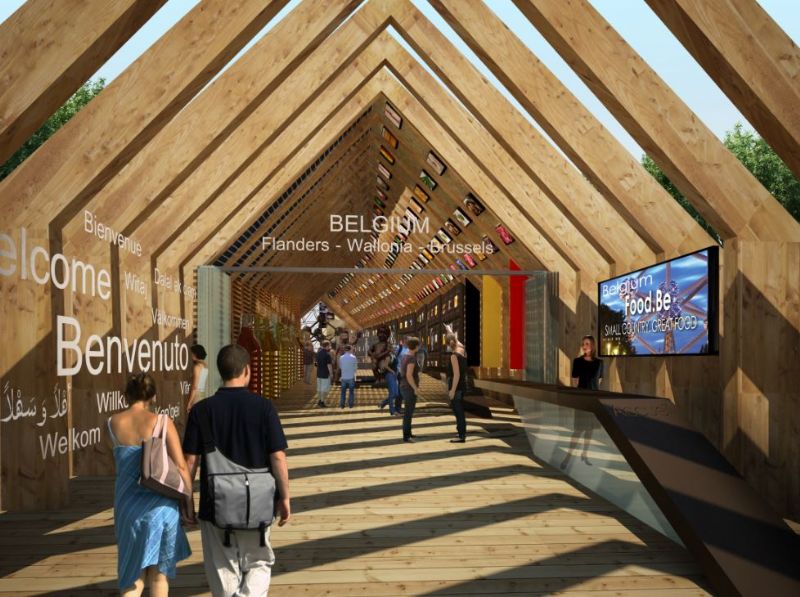 Dès le Decumanus − axe principal de circulation de l’Expo le long duquel s’organisent les différents pavillons − une Piazza multifonctionnelle attirera les visiteurs. Cet espace à l’air libre animé d’un grand écran Led, et aménagée de gradins en bois, permettra d’imaginer une multitude de scénarios de jour ou de nuit. Après avoir franchi l’espace d’accueil semi-couvert, le visiteur pénètrera dans le grand volume diaphane de la ferme baigné de lumière naturelle et tamisée par une mosaïque d´écrans qui envelopperont littéralement le visiteur. Cette première zone située dans la Ferme a pour objectif de dresser un portrait actuel et séduisant de la Belgique. Le visiteur sera attiré depuis l’extérieur à entrer dans le pavillon, il découvrira, à travers l’espace Food.be « Small Country, Great Food », les principaux produits belges de grande qualité et de renommée mondiale (le chocolat, la bière, la pomme de terre…) ainsi que d’autres richesses de notre industrie alimentaire. On trouvera aussi un clin d´œil destiné à la grande majorité des visiteurs italiens en présentant des personnalités belges célèbres d’origine italienne. Une « rampe du futur » avec des animations lumineuses plongera sous terre, et fera faire au visiteur un bond dans le temps (un marquage au sol accompagne de 2015 à 2050), expliquant les possibles innovations pour l’évolution de la planète : c’est une phase de prise de conscience des enjeux de la planète pour demain. La rampe débouchera dans un sous-sol artificiel, la Cave, qui sera informative et plongera le public dans une ambiance de pénombre. Un escalier de verre, inondé de lumière zénithale, se déploiera, tel l’ADN, en double hélices de plantes, dans le grand espace du dôme géodésique. Le visiteur débouchera alors au cœur du Pavillon, dans l’atrium, un espace fluide aux multiples fonctions intégrées autours du thème de la consommation. C’est l’espace de la jouissance, des saveurs, des odeurs, du goût, de la « convivialité à la belge » qui charmera le public. La consommation de nourriture devient alors partie intégrante de l’Expo avec différents types d’expériences.