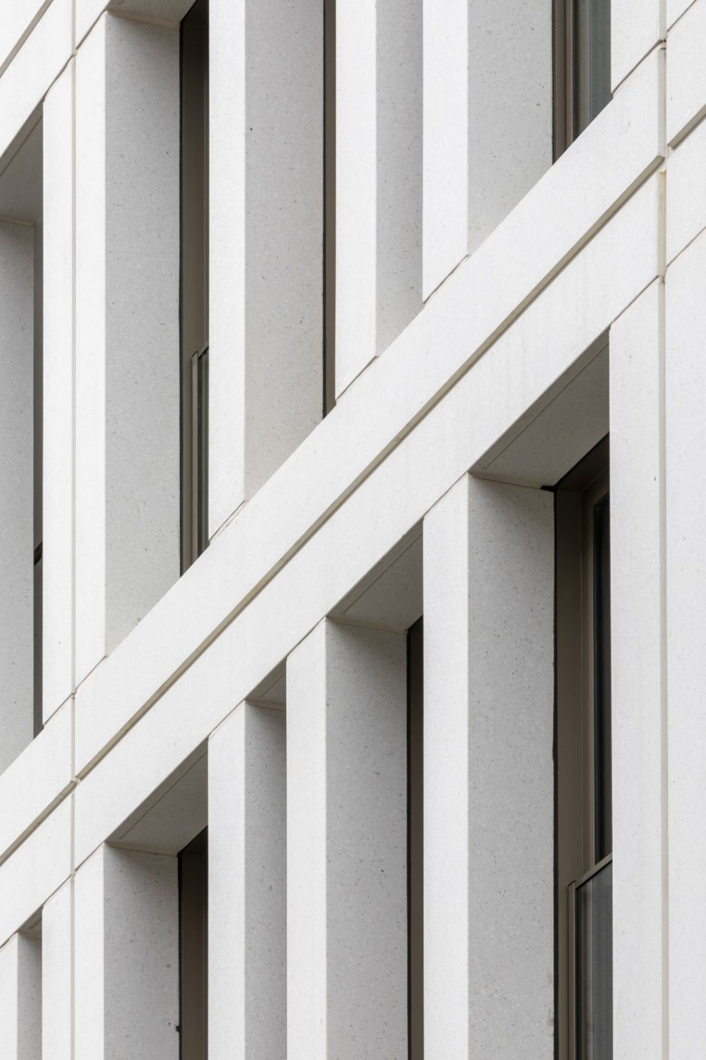 Lisse, blanc et épuré, le béton se décline sur l’ensemble des éléments structuraux. Il dessine une trame qui s’adapte aux fonctions : de larges baies ouvrent les restaurants sur la ville, puis, pour les logements, l’écriture se fait dense dans les premiers étages pour assurer l’intimité nécessaire au bien-être des habitants et, en hauteur, de larges ouvertures permettent aux habitants de profiter des vues dégagées sur la ville.