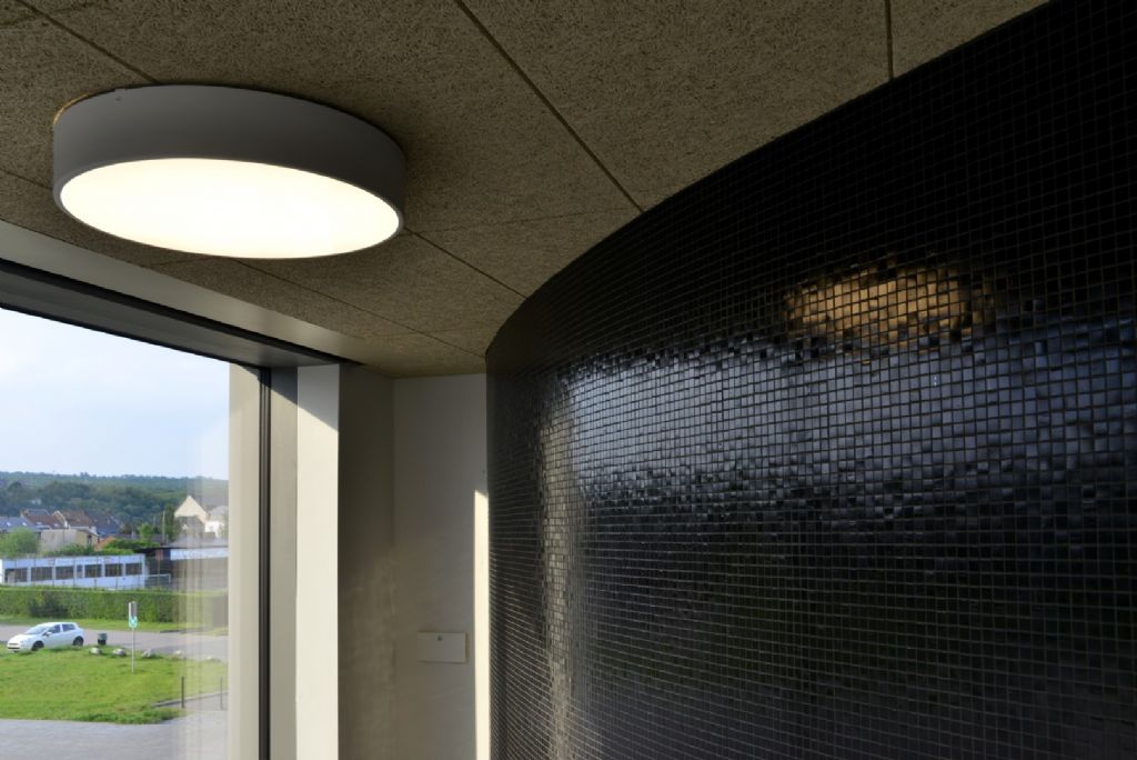 Les façades du ‘Phare’ sont revêtues de tuiles plates en terre cuite rouge, un matériau très présent dans la région d’Andenne. Les murs en briques existants des espaces muséaux ont été recouverts d’un enduit d’argile. « Cette finition conserve et augmente la capacité de régulation hydrique des murs en terre cuite, afin de rencontrer au mieux les objectifs de stabilité climatiques définies par les conditions de conservation attendue, sans technologies actives d’humidification à la saison froide », affirme l’architecte.