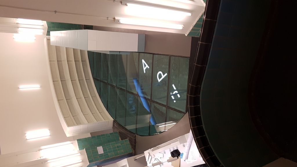 Le nouvel équipement, regroupement d’une série de fonctions culturelles et de l’Office du tourisme, se situe en bout de perspective de la Promenade des Ours, nouvellement créée, qui le relie à la Grand Place. Gil Honoré : « Nous voulions manifester la présence du bâtiment existant, et de sa piscine en particulier, malgré l’adjonction d’espaces complémentaires nécessaires pour rencontrer le programme. Nous avons donc fait apparaitre la paroi courbe qui enclos l’espace de la piscine en ouvrant fortement l’angle du bâtiment. Celle-ci est elle-même percée, ce qui crée une profondeur de champ qui permet de percevoir le volume de la piscine depuis l’entrée. Nous avons habillé cette paroi courbe, sur l’extrados, de mosaïques noires de petits formats, surface pixellisée qui renvoie tant la lumière que les reflets de l’extérieur.