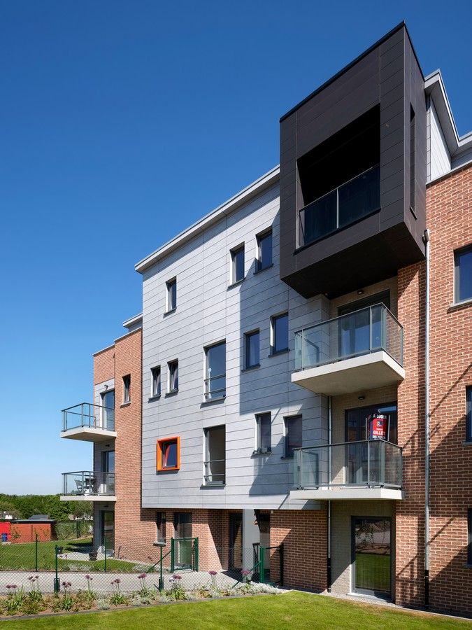 Du béton architectonique gris a été utilisé pour les 50 terrasses des appartements. Les éléments constituant les terrasses ont été livrés par SVK ELBETON. Julie Delorge, chef de projet pour le bureau d'architecture Atelier de l’Arbre d’Or : « Pour l’écoquartier, nous avons porté une grande attention aux façades des différents bâtiments. Pour les appartements, nous avons défini une image spéciale avec le partenaire associé du bureau Bernard Voglet. La façade est une combinaison de briques rouges et beiges, avec un certain nombre de sections de façade en panneaux d’Eternit. Nous trouvions que les balcons gris en béton architectonique s’intégraient bien. La finition acidée s’accorde bien avec la structure de la façade. L’entrepreneur a décidé de travailler avec la SVK Elbeton. Nous avons déjà travailler avec des éléments provenant de chez SVK par le passé pour d’autres projets et l’expérience n’est que positive. »
