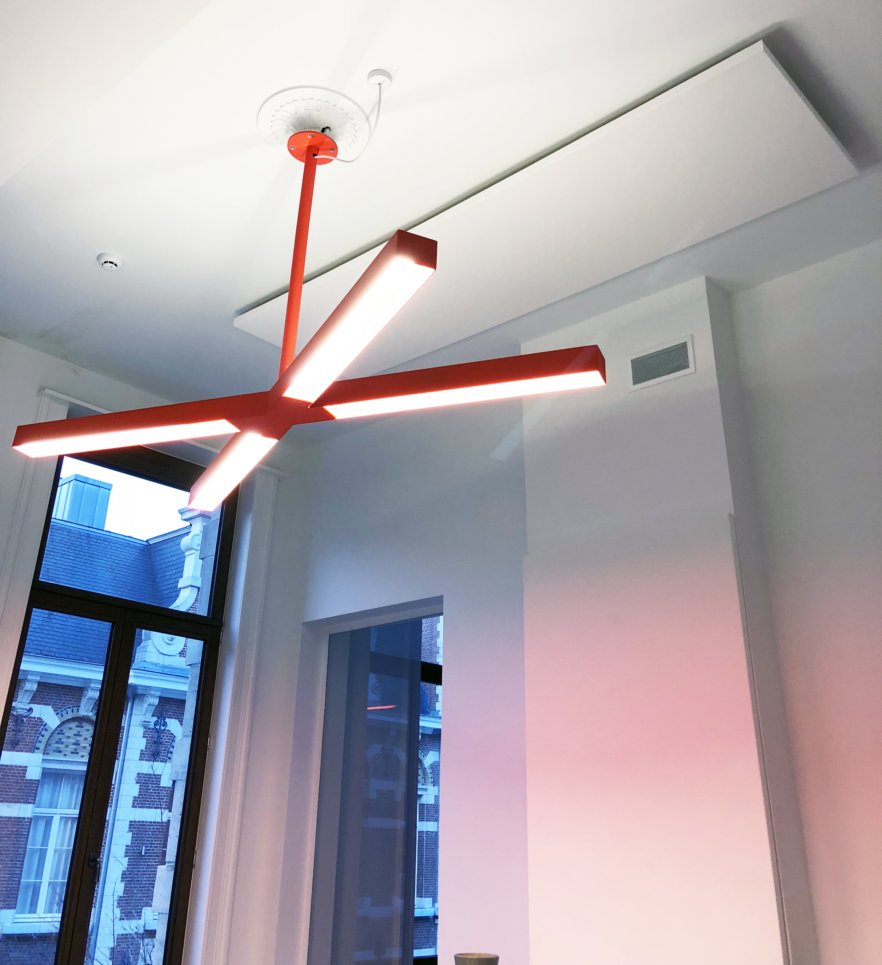 D-Sound est une solution esthétique très élégante qui réduit sensiblement la réverbération dans les espaces. Les panneaux sont très polyvalents. Dans ce cas, ils ont été utilisés d’une manière très discrète dans les bâtiments. Dans ce projet, bruit et réverbération sont déjà réduits par les panneaux dans le couloir, de telle sorte que moins de bruit ne pénètre dans les bureaux adjacents. En combinaison avec des panneaux acoustiques dans les bureaux eux-mêmes, cette solution procure un excellent confort sonore. Les panneaux ont été suspendus aux plafonds au moyen de ressorts spiralés. Ainsi est créé un plénum minimal entre le panneau et le plafond, permettant une absorption sonore supplémentaire.