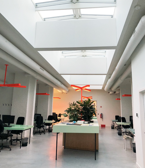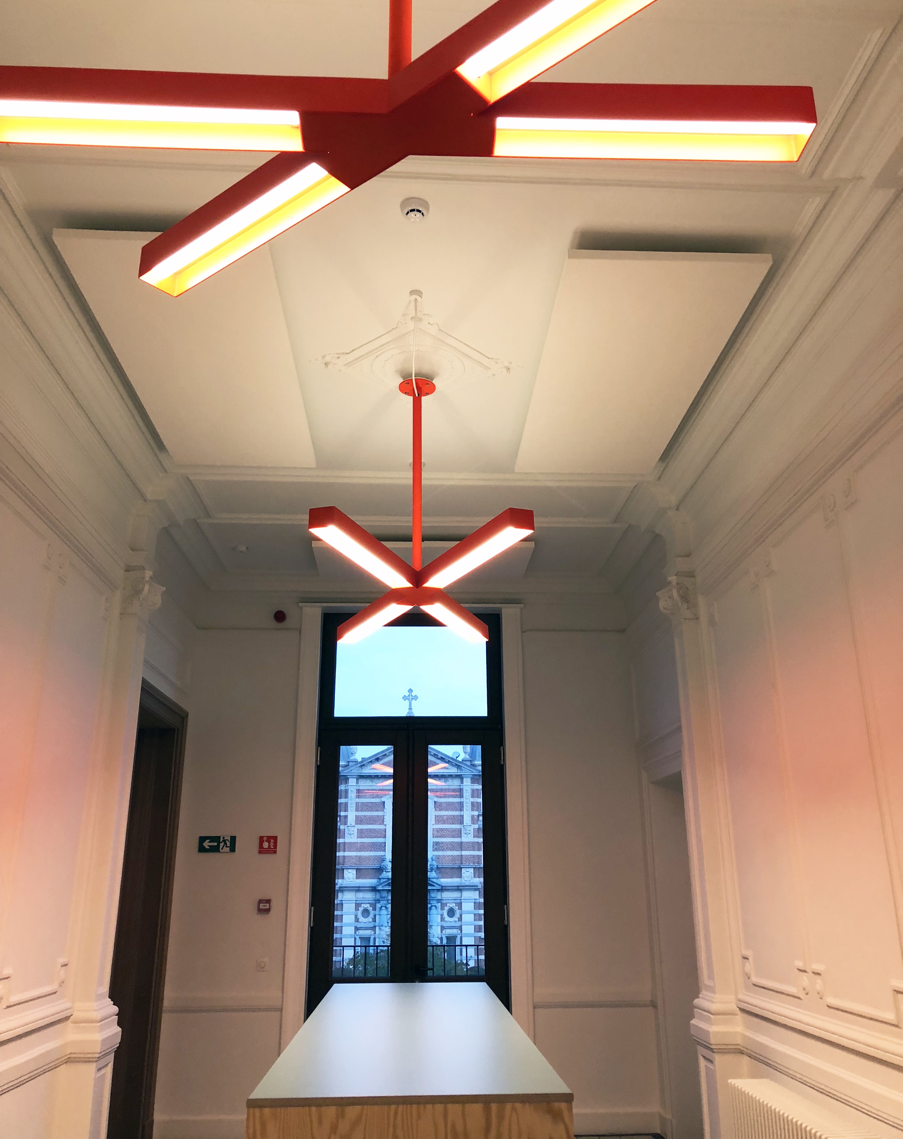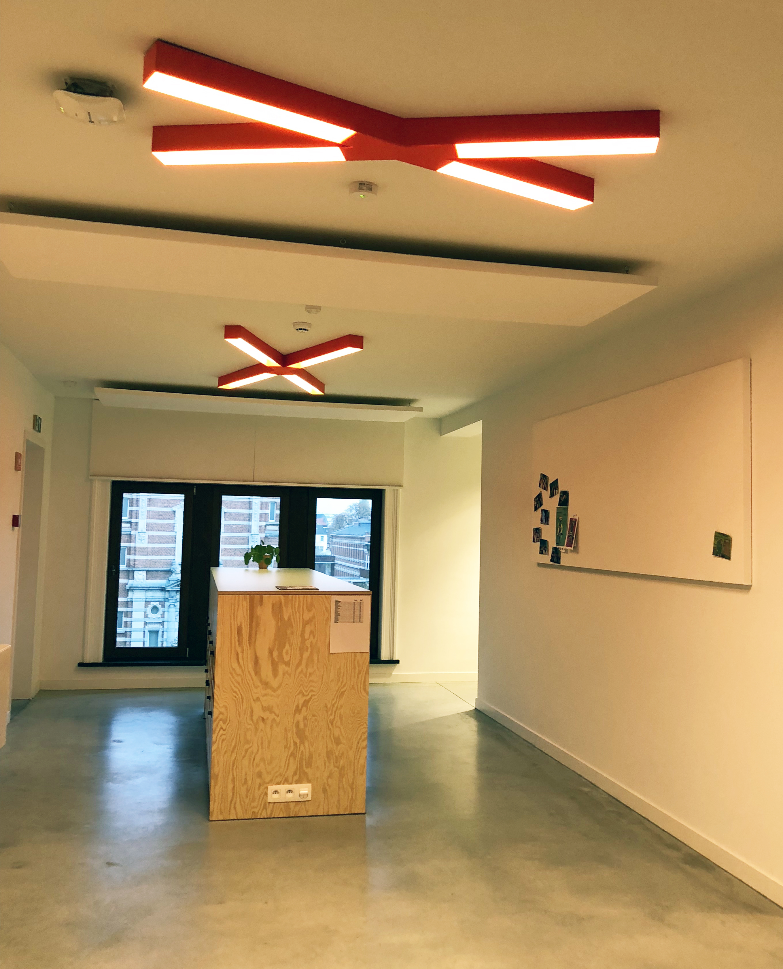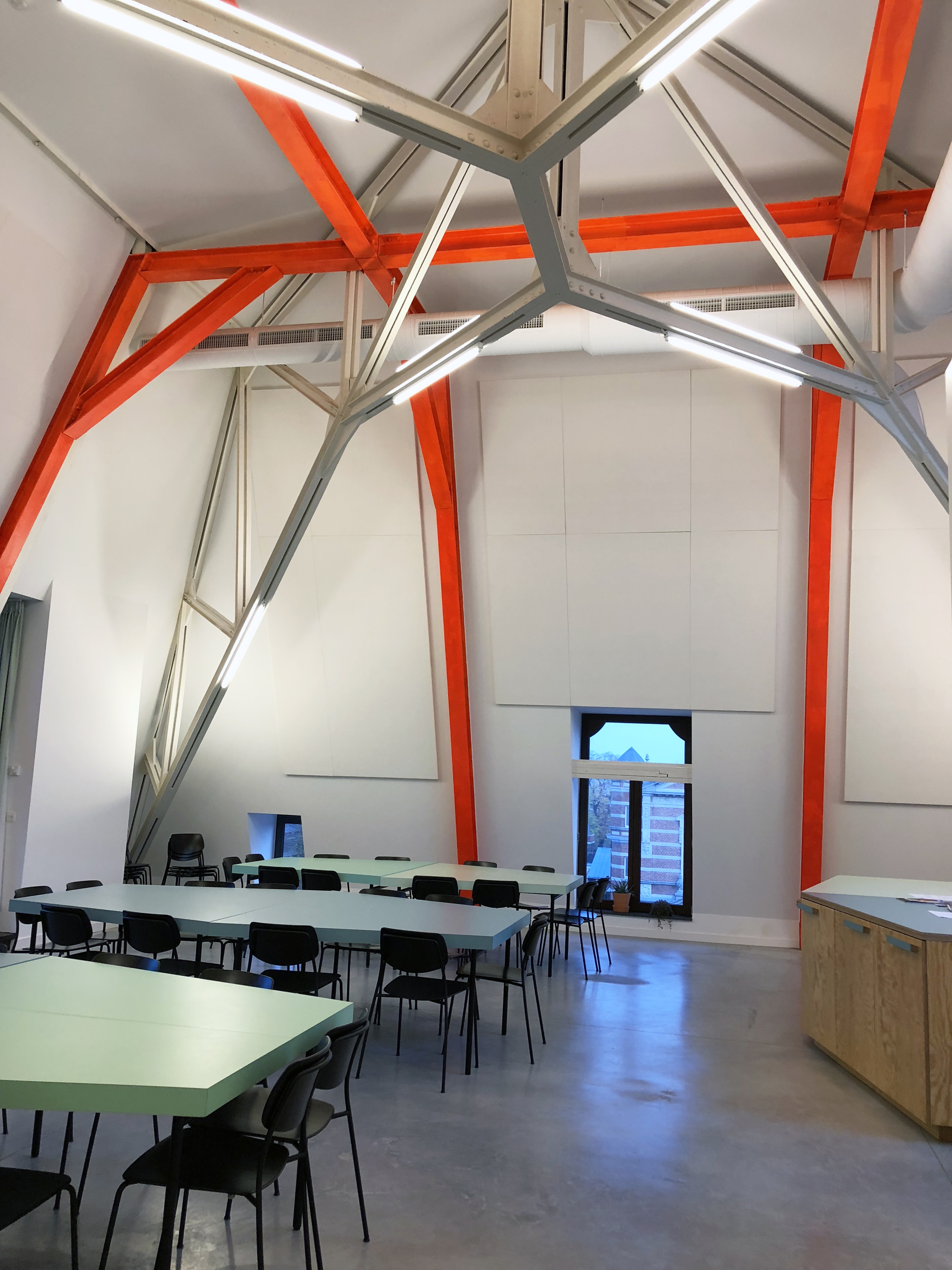 Cette réaffectation ne s’est pas déroulée sans penser au confort acoustique. Un poste de travail dans un bâtiment historique a beau stimuler l’imagination, il est également source de nombreux défis notamment au point de vue acoustique. C’est pourquoi une ambiance acoustique saine a été recherchée avec DOX Acoustics. Un plan entièrement conçu sur mesure a été rédigé en concertation avec le client. Les différents espaces de bureau, les salles de réunion, le couloir et la cuisine sous les combles ont été équipés de panneaux acoustiques de la gamme D-Sound.