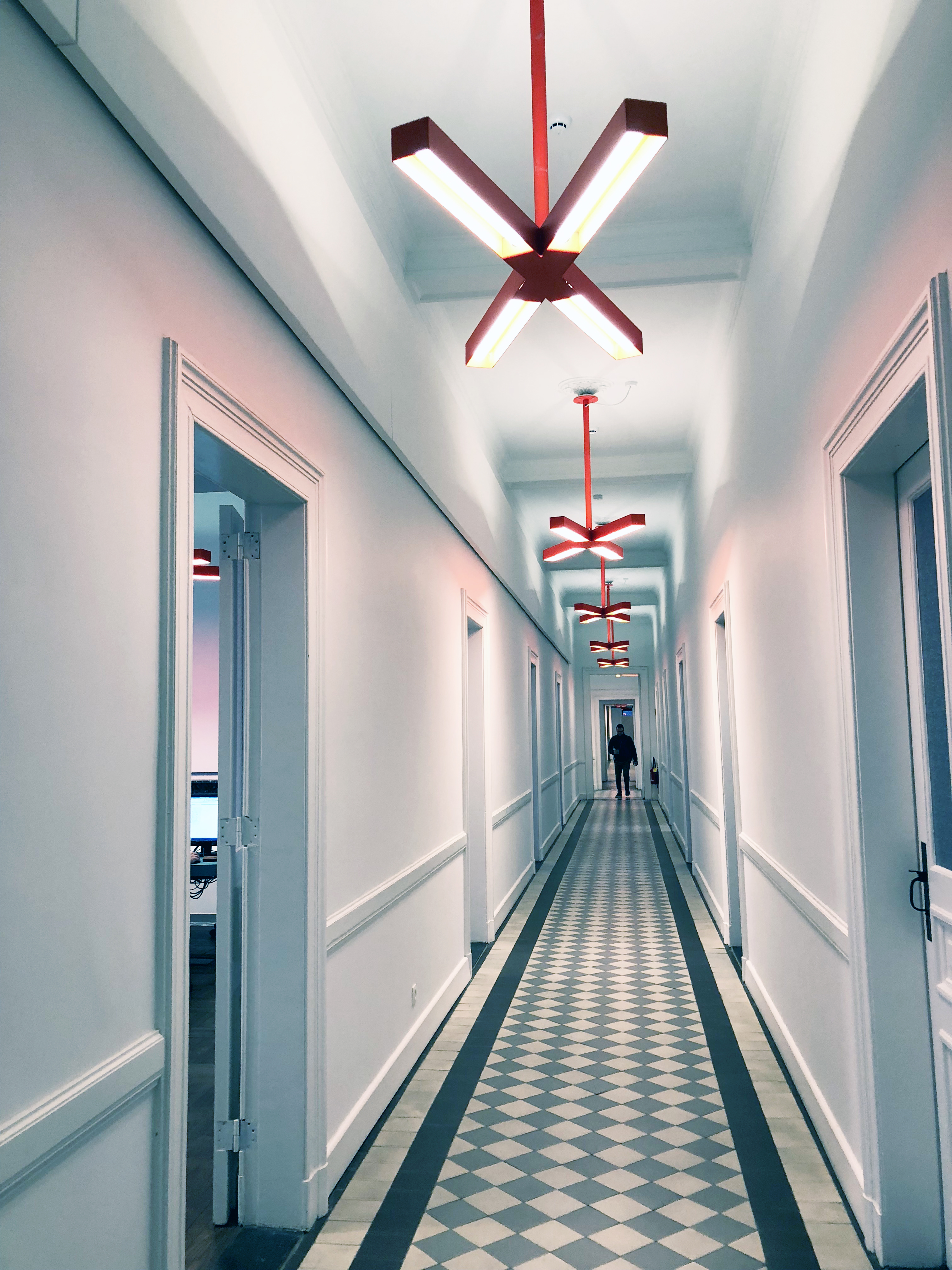 Dans l’élégante cuisine sous les combles, les parois obliques ont elles aussi été équipées de panneaux D-Sound. La réverbération sous la haute toiture en pente est ainsi absorbée, permettant aux employés de profiter d’une pause ou d’une discussion tranquille. Dans l’espace de bureau paysager avec verrières, des transitions ont été réalisées avec des panneaux D-Sound collés sur les côtés des verrières. Dans le long couloir, il a même été possible de placer des panneaux en hauteur contre les cloisons et ce sur toute la longueur. Découpés sur mesure, les panneaux y sont présents de façon discrète. La combinaison de toutes ces applications donne le résultat escompté. Il se dégage de l’état-major un sentiment de calme et d’unité, avec des bureaux contemporains dans un bâtiment historique où il fait bon travailler sans écho.