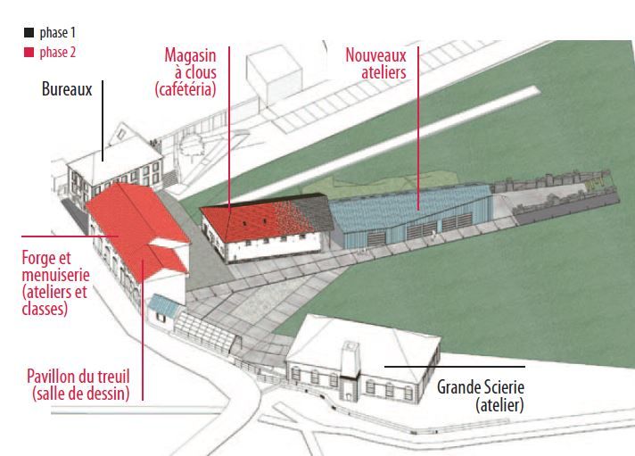 Une seconde phase de travaux concernera plus particulièrement la restauration des autres bâtiments classés du site alliée à la construction d’un nouveau bâtiment. Ceux-ci abriteront à terme des ateliers et classes supplémentaires, une salle de dessin et une cafétéria d’une cinquantaine de places. Le marché public visant à désigner les entreprises chargées de ces travaux a été lancé, ce qui permettra à ceux-ci de débuter dès l’automne 2017 pour se terminer début 2020.