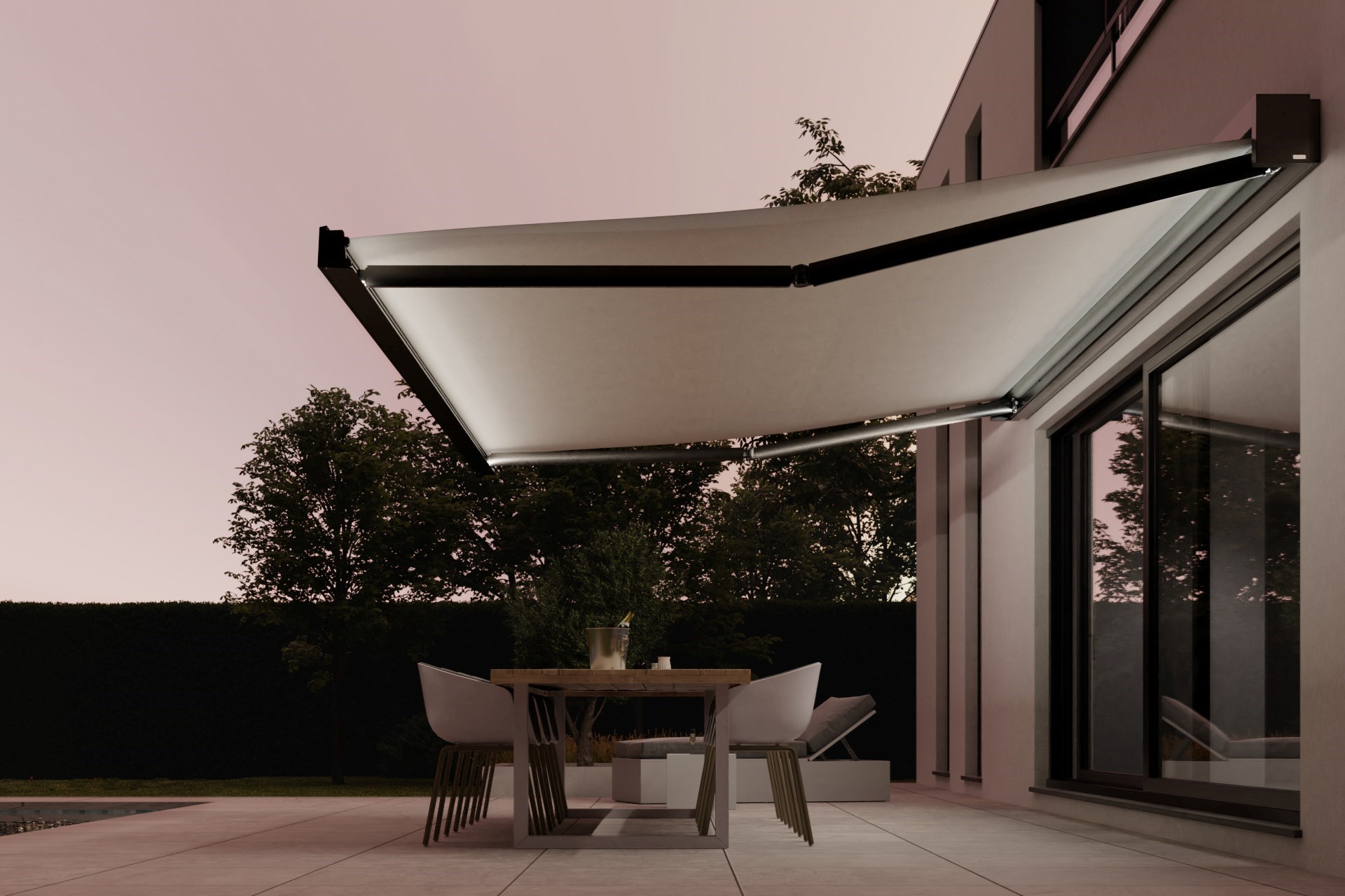 Lux garantit une fraîcheur naturelle optimale : jusqu'à 28 m2 d'ombrage sur votre terrasse, avec une projection maximale de 4 m et une largeur de 7 m. Un raccord est également possible jusqu'à 12 mètres pour encore plus d'ombre avec un look uniforme tout en sobriété. Cette vaste zone d'ombre peut encore être étendue grâce à un lambrequin à commande automatique dans la barre de charge, avec une projection maximale jusqu'à 2 mètres. L'idéal pour protéger de la chaleur, mais aussi de l'effet aveuglant d'un soleil bas. Lux peut aussi être équipé d'un éclairage LED à intensité réglable (direct ou indirect) au niveau du caisson, de la barre de charge et des bras, et du chauffage. Les capteurs de sécurité vous permettent également de jouir de la vie extérieure en toute sérénité.