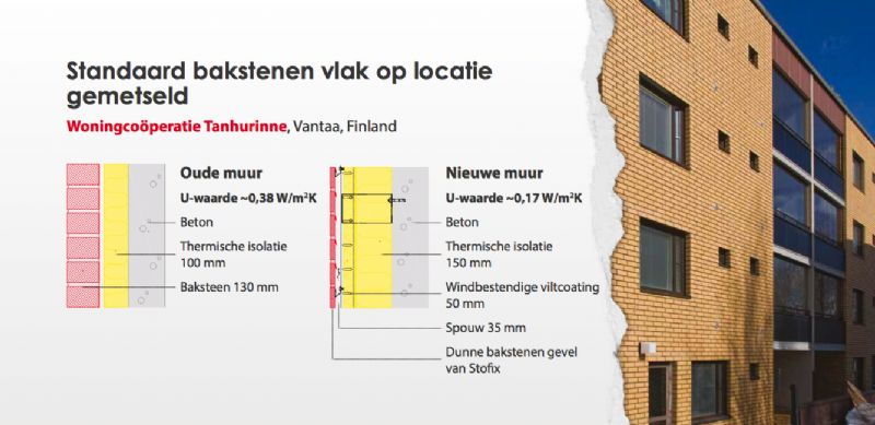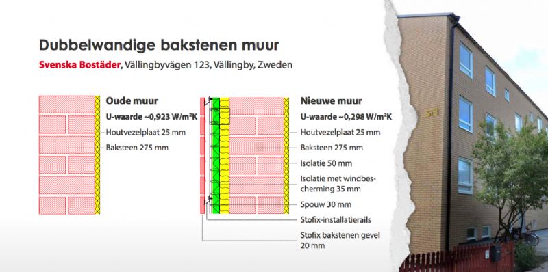 Cela signifie que les murs ne doivent plus être maçonnés sur le chantier, ce qui représente des économies substantielles de temps et d’argent. Le mur Stofix présente une épaisseur de brique plus mince, ce qui permet plus de place pour l'isolation et la coulisse ventilée. Grâce à un système de rail, le système convient aussi bien à la rénovation qu’aux nouvelles constructions. En rénovation, le nouveau parement de briques peut simplement être fixé à l'ancienne façade.