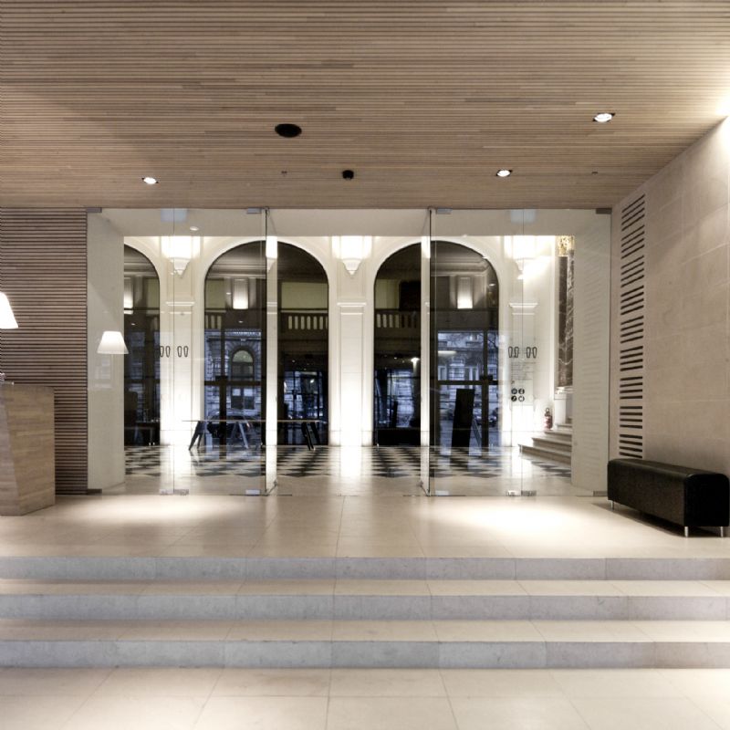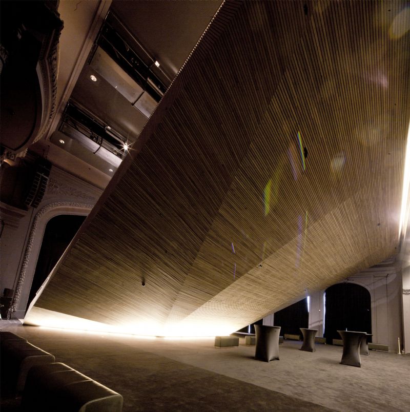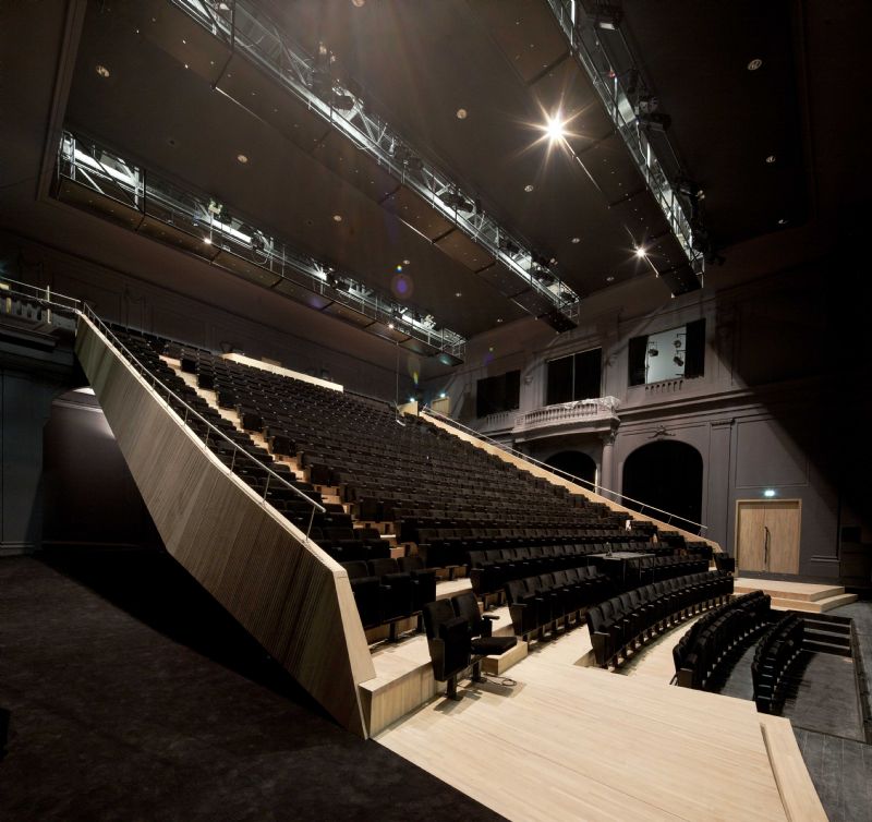 La nouvelle fonction des lieux, transformés en théâtre, a demandé une étude acoustique précise pour empêcher le son de sortir du théâtre, mais aussi d’y rentrer. Dans cette optique, le travail sur la façade vitrée de la petite salle a abouti à une solution technique et architecturale. La petite salle est à la fois une salle de répétition et une salle de spectacle. Son positionnement sur la Place du XX août, très bruyante, et le choix de l’ouvrir sur la ville par sa façade vitrée, demandait un affaiblissement acoustique hors du commun. La collaboration entre architectes et acousticiens a donné naissance à une façade inclinée, combinant différents ensembles vitrés enfermant une lame d’air d’épaisseur variable, afin d’agir sur tout le spectre sonore. A l’intérieur, la qualité acoustique initiale de la grande salle a permis de réduire l’équipement aux systèmes classiques d’absorption acoustique (abat-son, faux-plafond acoustique,…). Dans les espaces d’accueil, la cafétéria et le grand hall de l’étage, un lattis en bois ajouré recouvre une épaisseur d’isolant en laine de roche et qui améliore l’ambiance sonore.