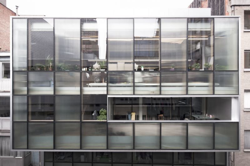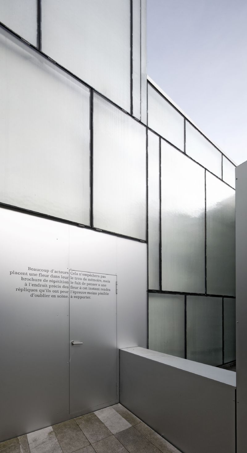 L’aspect patrimonial a été le moteur d’une solution architecturale et technique inédite dans le monde du théâtre. En effet, la grande salle, dénommée la Salle de la Grande Main, est équipée d’un gradin de plus de 500 places, qui paraît en lévitation. Sa forme et sa structure répondent aux contraintes patrimoniales qui n’autorisaient aucune intervention sur les parties classées, notamment les murs latéraux. Ainsi, le gradin est ancré au sol dans sa partie avant et se pose via un système d’amortisseurs en partie supérieure, sur la structure existante. L’atelier d’architecture Pierre Hebbelinck et Pierre de Wit a relevé un autre niveau de lecture patrimoniale. L’architecte Koenig, dans son projet de 1939, a instauré une logique de transparence à travers le bâtiment. Avec sa configuration et son système de plan libre, il est en effet possible de traverser le bâtiment du regard, par part en part. Cette volonté a été mise en exergue et interprétée par l’intervention des architectes. Cette transparence se matérialise entre autres par l’usage du verre en façade. Les nouvelles façades du projet sont ainsi recouvertes d’un parement en panneaux de verre présentant le plus souvent un relief qui fragmente le regard. L’emploi du verre a pour volonté d’unifier les lieux et d’en simplifier la lecture à travers le quartier, mais aussi de permettre des sensations de profondeur et de longues percées visuelles à travers le bâtiment, lorsque le vitrage est lisse.