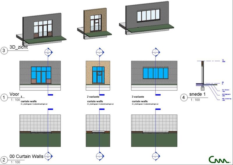 Le jeu standard « Portes et Fenêtres » est immédiatement utilisable dans la plupart des situations, mais pour les conditions non prévues, la méthode des murs-rideaux dans Revit est indiquée, à la place de la construction de familles paramétriques spécifiques à une situation unique. Pour cela, un sous-jeu de « Portes et Fenêtres » a été également élaboré en tant que « Portes-mur-rideau » et « Fenêtres-murs-rideaux ». Des ouvertures dans une cloison peuvent être facilement réalisées via quelques « ouverture de fenêtres » prévues (incluant des seuils, des linteaux, etc.), dans lesquelles un mur rideau sera construit pouvant être rempli de manière flexible selon les besoins.