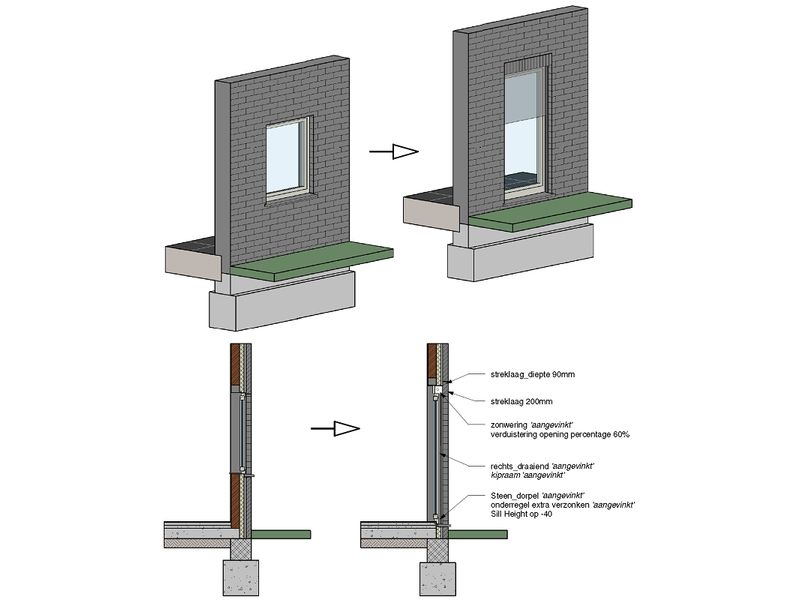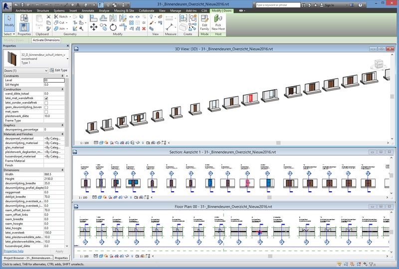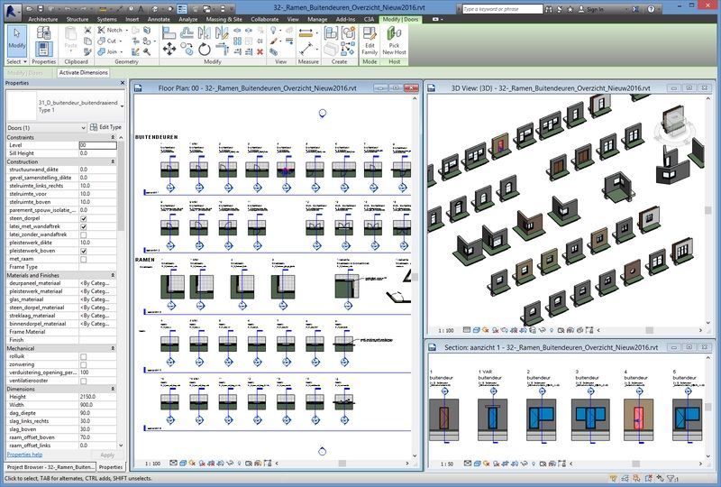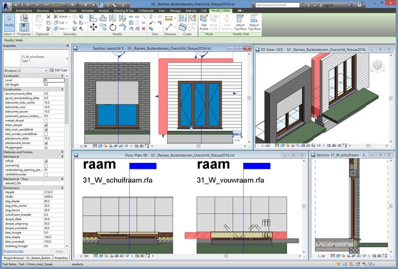 Dans la version 2016 la plus récente des extensions C3A-Revit, une série de nouvelles portes et fenêtres a entre autres été rendue disponible. Celles-ci ont été complètement construites à partir de zéro comme un jeu de fichiers .rfa imbriqués : la technique de construction est mieux détaillée, utilisable dans Revit aussi souplement que possible, et avec de meilleurs services que tout ce que nous avons connu jusqu’à présent. Une grande attention a été portée aux possibilités d’extraction de métrés, en tenant compte de la méthode d’extraction de données de C3Admin.