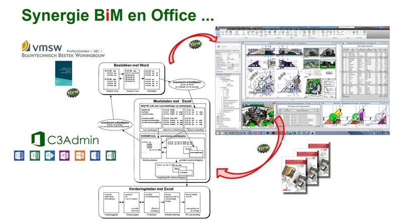 Grâce à un mécanisme d’export C3A dans Revit et un mécanisme d’import C3A dans Excel, toute la géométrie sera versée conformément à la méthode de travail dans Excel et de manière automatique dans un métré de détail bien lisible et exploitable, en incluant des services de contrôle et des possibilités de mise à jour s’il devait encore y avoir des changements dans le modèle virtuel BIM-Revit. Les outils C3Admin continuent à se charger des synthèses, offres de prix, comparaisons de prix, états d’avancement, et similaires.