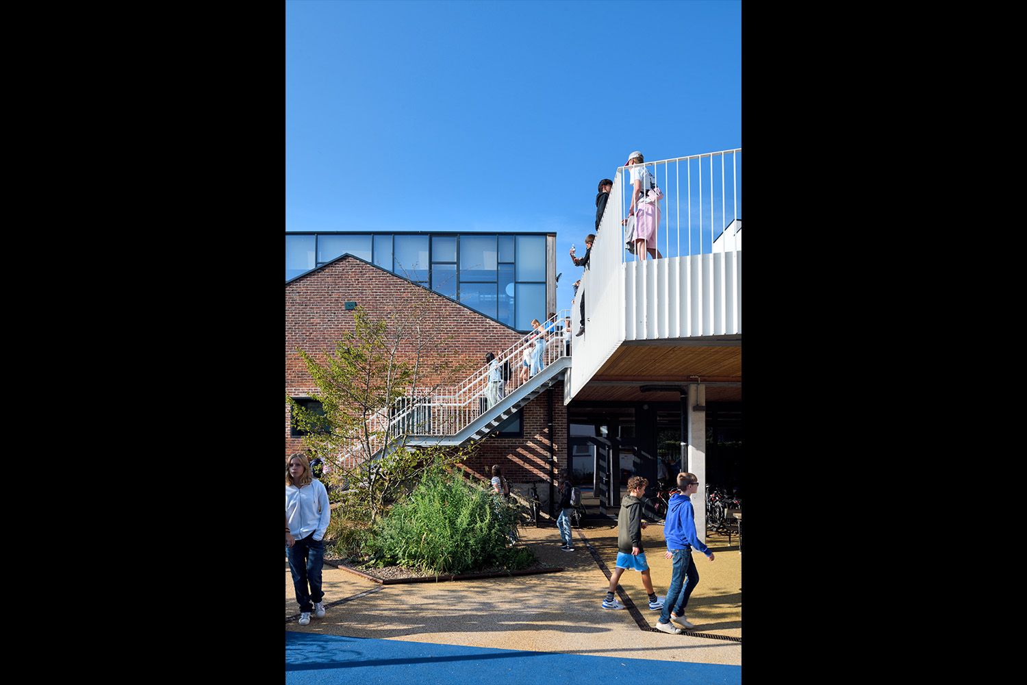L’ADN du projet pédagogique de l’École Active repose sur la possibilité des enfants et des adultes de se retrouver et d’échanger dans des espaces informels permettant une autre approche des apprentissages et des savoirs. D’ateliers participatifs préliminaires est né le projet architectural avec ses particularités et ses lieux de contacts et de partage “hors des murs de la classe”. L’organisation spatiale du nouveau complexe scolaire trouve sa cohérence et son efficacité par la mise en continuité d’une série de lieux (terrasses, passerelles, coursives, mezzanine, halle) ouverts à la diversité des appropriations (circulation, récréation, détente, ateliers, représentation, échanges, ...).