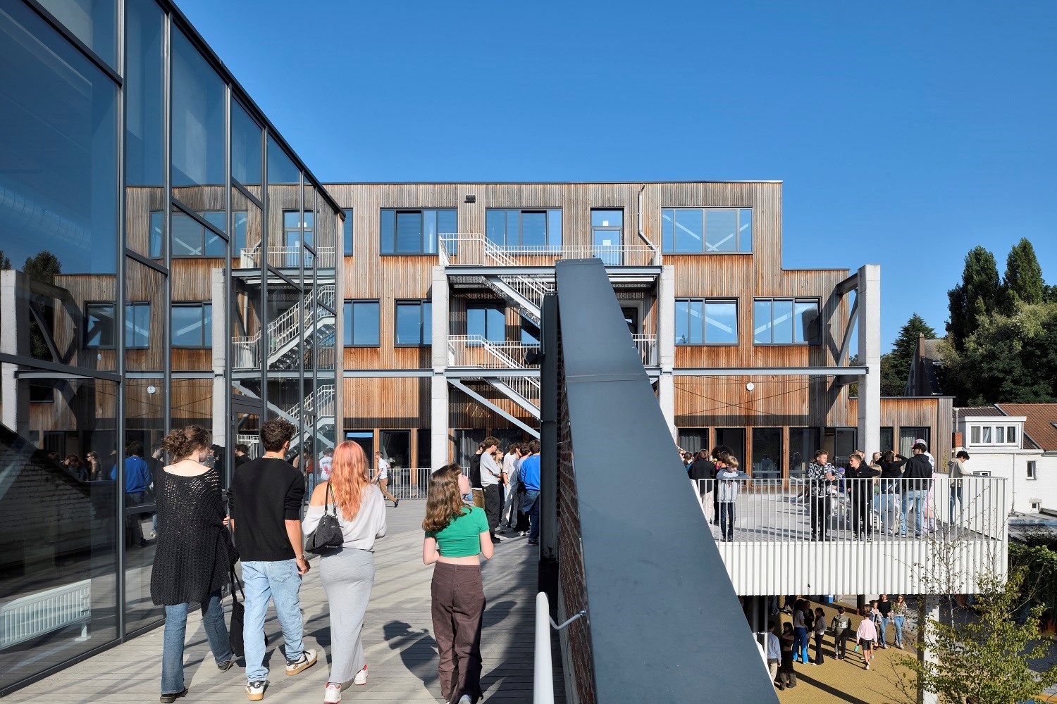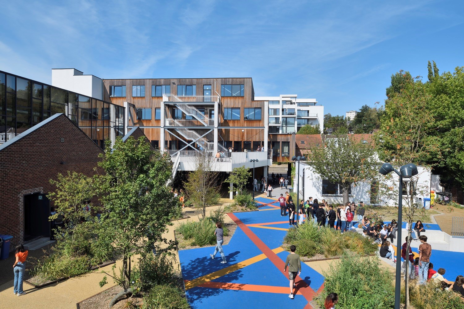 Le projet architectural développé par ARTER s’ancre dans une vision écologique et présente une série d’options reposant sur la durabilité de la construction et le principe d’économie circulaire. Ainsi, d’anciens bâtiments industriels ont été réhabilités pour l’usage scolaire et le hall de sports. Les matériaux structurels et de finition ont été choisis en fonction de leur faible empreinte écologique et de leur possible réutilisation.