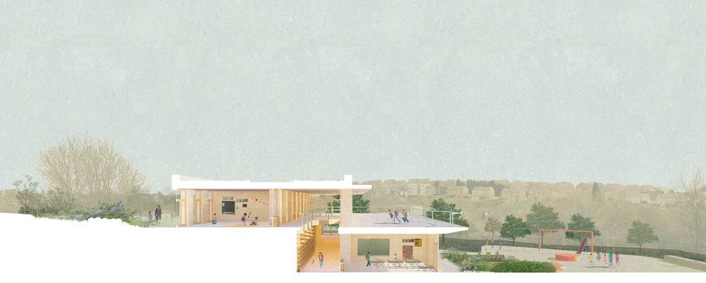 « Vue en coupe, l’école est organisée en deux niveaux, à la façon des maisons du quartier qui s’implantent dans la pente avec un étage au niveau de la rue, et un étage au niveau du jardin. La section maternelle occupe le niveau supérieur, aligné avec l’entrée, tandis que la section primaire occupe le niveau inférieur, aligné avec le verger public. Chacun des deux niveaux possède une séquence d’espaces de plain-pied associant horizontalement classes, jardins pédagogiques, auvents et cour. L’ensemble est relié par une généreuse galerie centrale sur double hauteur. Elle est rythmée par un jeu d’escaliers, de passerelles, de niches et de murs bibliothèques qui favorisent les relations entre les deux sections. Le profil de l’école est suffisamment bas pour ne pas obstruer la vue depuis les maisons au nord. »