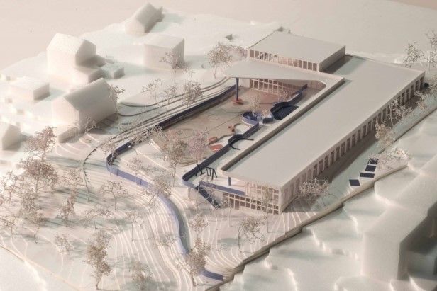« Perçu depuis le site actuel de l’école, le paysage paraît fermé par la topographie et fragmenté par les infrastructures », explique-t-on sur le site de Matador. « Mais, vu d’en haut, le paysage redevient ouvert et lisible. Le regard s’étend jusqu’à l’horizon des collines voisines. On voit la course du soleil. Le premier principe est donc de concevoir l’école comme un long balcon tourné vers le paysage. En contrepartie, un volume contenant les fonctions bruyantes (sport, fête, réfectoire) est implanté parallèlement à l’autoroute pour protéger les espaces de classe et de récréation contre le bruit de cette dernière et des vents importants sur la ligne de crête. »
