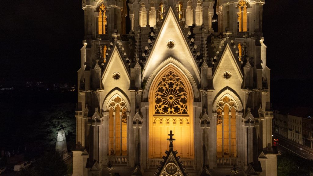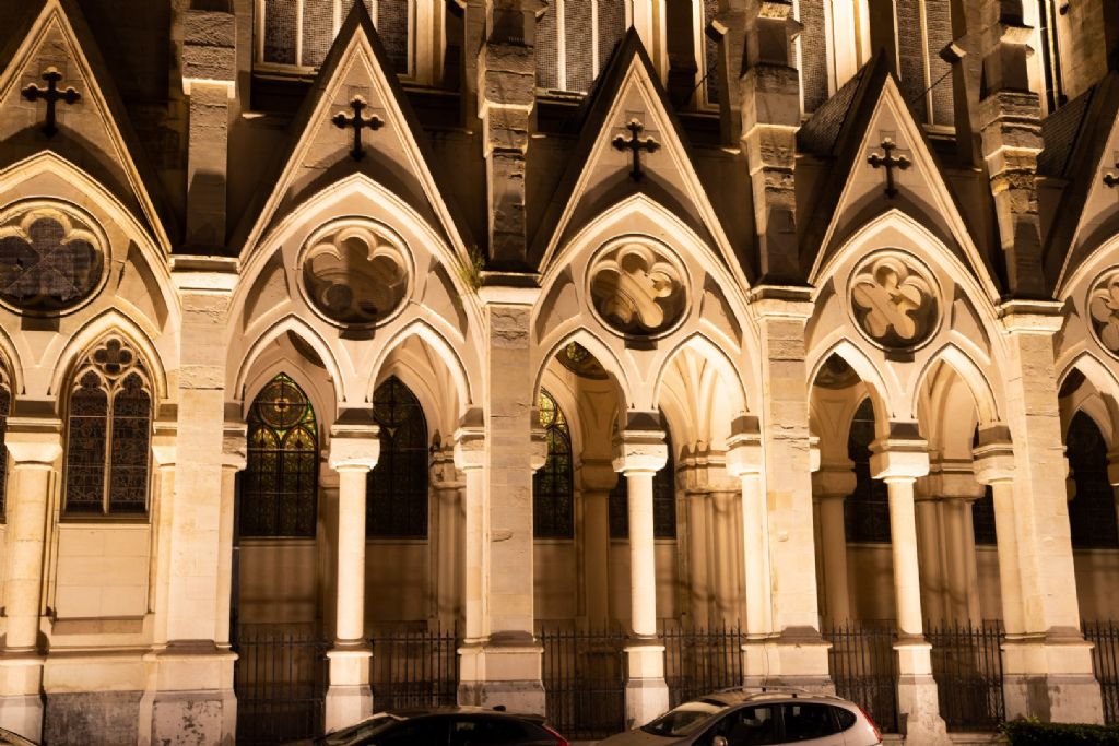 350 projecteurs et 5 km de câbles ont été nécessaires pour éclairer l’ensemble des façades. Les luminaires ont été principalement installés sur le bâtiment, réduisant ainsi la pollution lumineuse pour les riverains. On compte 18 types d’ancrages différents, choisis pour créer un éclairage subtil et respectueux du patrimoine. Le matériel d’éclairage est discret et à peine visible depuis le parvis de l’église.