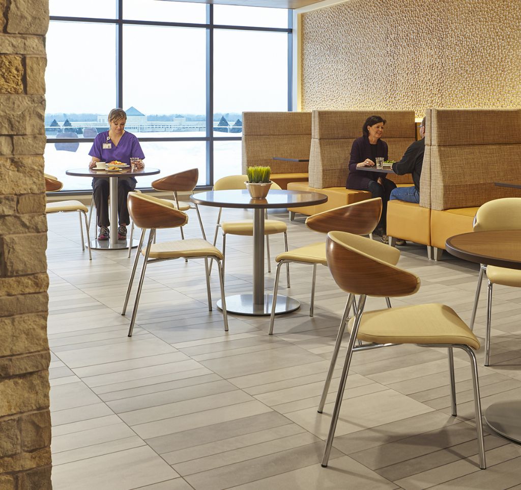 Étant donné que les patients doivent se rendre très souvent dans l’établissement, les designers ont choisi de travailler avec des matériaux dont l'apparence change selon le moment de la journée et l'angle de vue. La série Terra Tones de Mosa, avec ses teintes et ses profondeurs différentes, contribue à créer cette dynamique. La composition des couleurs des carreaux de sol souligne les constantes variations de lumière et renforce la dimensionnalité du design. La palette de couleurs utilisée à l'intérieur est par ailleurs assortie au paysage qui entoure le centre de soins. Madame Clinger ajoute: « Nous avons obtenu un résultat séduisant et organique. Mosa a réussi cette prouesse en utilisant des carreaux reproduisant des motifs naturels, où il n’y a pas deux carreaux semblables ».