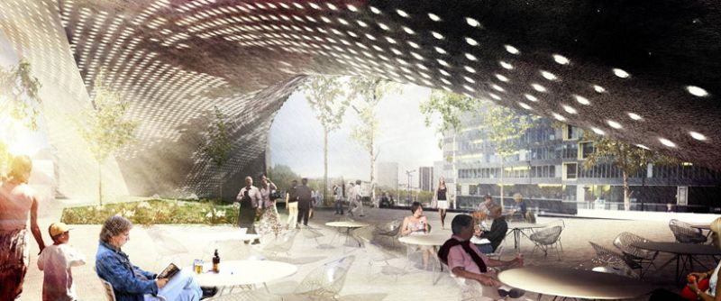 La voûte couvrant la place publique sera illuminée par des ampoules LED, prévues pour représenter le courant permanent d'informations qui passe comme des nuages dans le ciel.