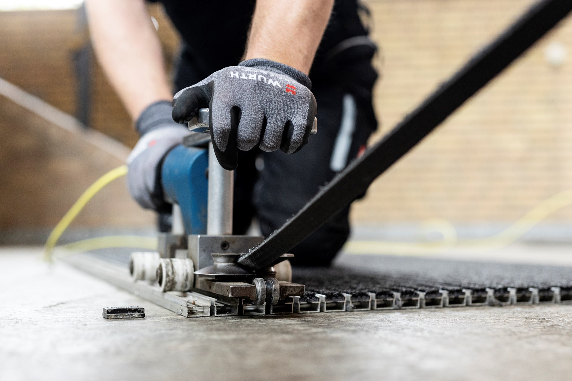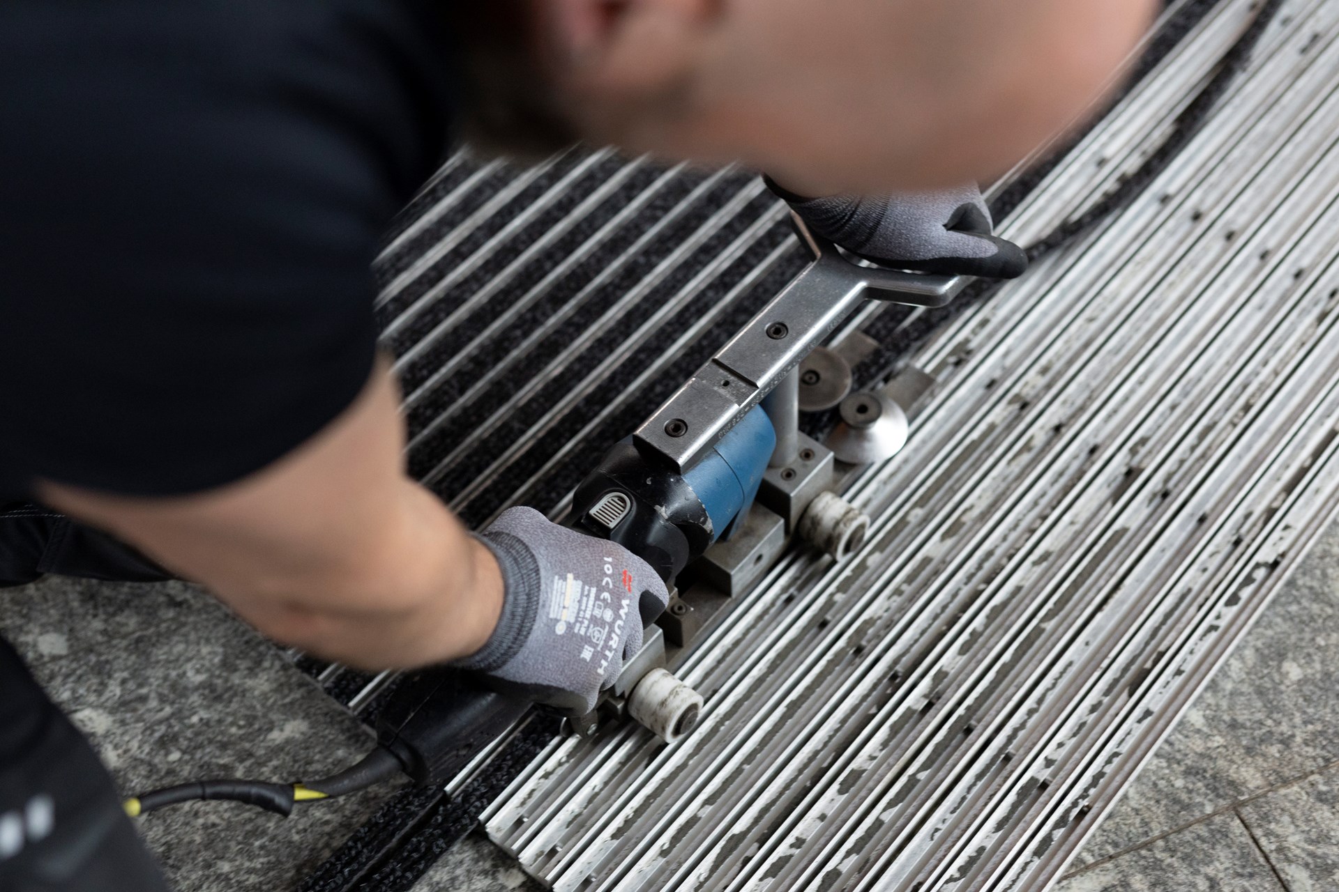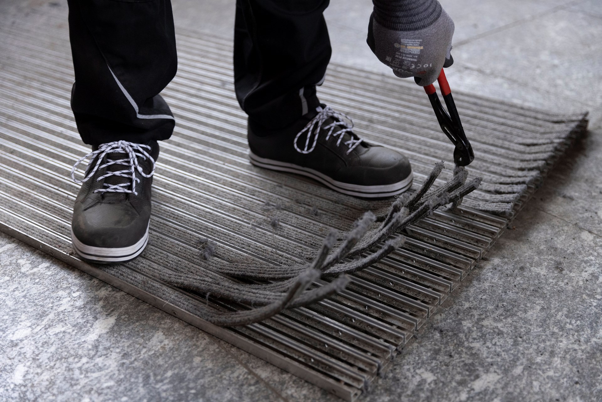 Cette opération est effectuée simplement et rapidement par le département service d'emco au moyen d'un équipement technique spécialement conçu à cet effet. En cas de remplacement total, divers coloris sont disponibles. En quelques heures, le tapis d'entrée est comme neuf, et ce, de manière durable, responsable et économe.
