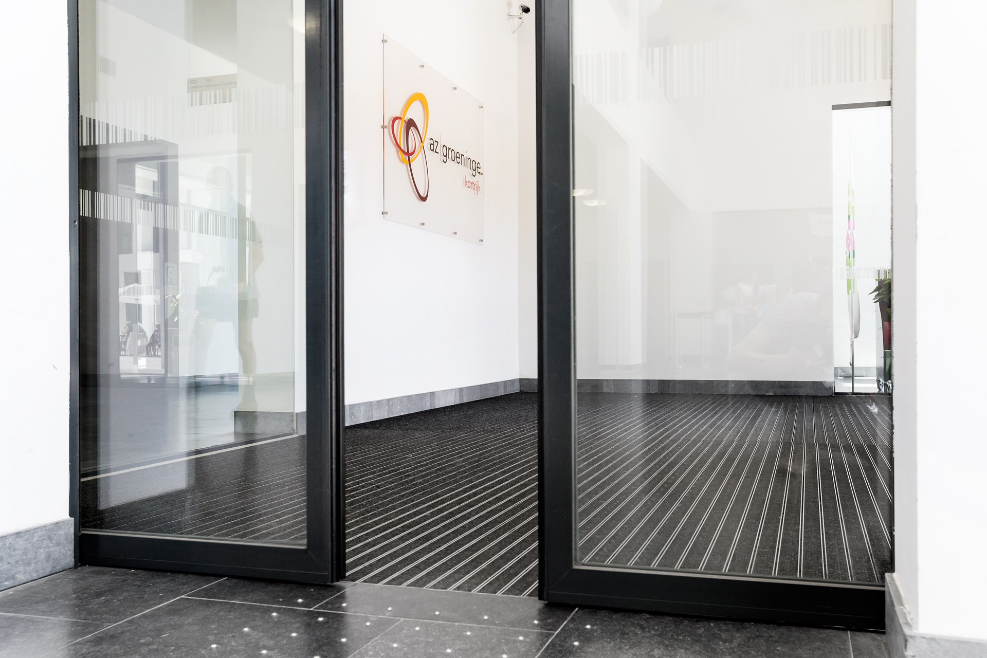 L'AZ Groeninge a installé des tapis d'entrée emco Diplomate Original Large équipés d'un revêtement reps à poils durs. Placés dans des profilés en aluminium, ces inserts doivent être remplacés par des nouveaux. Le remplacement peut être partiel ou total.