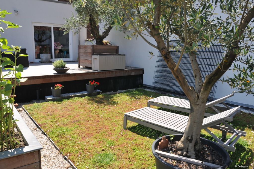 Les toitures vertes peuvent grosso modo être divisées en deux catégories : les toitures vertes extensives et les toitures vertes intensives. Une toiture verte extensive avec des plantes succulentes, des mousses et des herbes a une couche de substrat relativement fine, car les plantes n'ont pas besoin de beaucoup d'eau pour pousser. La charge n'étant pas aussi importante, la structure porteuse doit également être moins solide. Une toiture verte extensive peut être installée sur pratiquement n'importe quelle maison ou bâtiment. En plus, une telle toiture ne nécessite qu'un entretien annuel. Une toiture verte intensive, en revanche, nécessite autant d'entretien qu'un véritable jardin. Que vous souhaitiez en faire une pelouse ou un jardin luxuriant avec des arbres et des arbustes, une toiture verte intensive n'est possible qu'avec une épaisse couche de substrat. Une structure portante adaptée et renforcée est donc nécessaire. Entre ces deux extrêmes, il existe bien sûr de nombreuses formes transitoires, les toitures vertes semi-intensives.