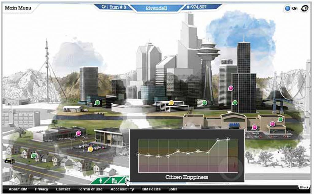 C’est ce que propose par exemple l’entreprise Enodo avec le logiciel CryEngine, qui se veut plus intuitif que les outils du BIM, une réalité encore trop complexe à mettre en place en raison de l’organisation du secteur professionnel (en France). Un des projets d’Enodo, l’application ludique Phosphorecity a été développée pour Eiffage et offre la capacité de lire la ville à travers différentes grilles de lecture dans une approche de type SimCity. Le joueur y crée lui-même les raisons de l’échec de la ville, par les externalités qu’il génère en accroissant son projet. Mais dans ce type d’approche, « il existe un écart important entre la simulation du jeu, orientée vers une narration et un effet sur le joueur, et le comportement urbain réel. « Le jeu va laisser au joueur une liberté de conception qui n’existe pas dans une véritable ville. »