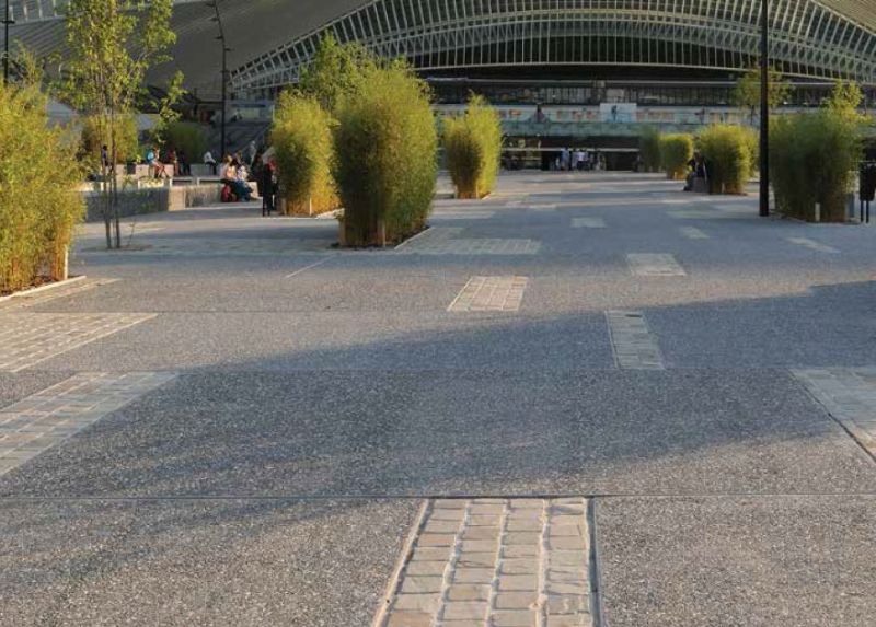 Sur le plan fonctionnel, l’Esplanade a été voulue comme un espace polyvalent et flexible. En plus d’assurer la fonction de lieu de rassemblement, le site se présente surtout comme un carrefour de circulations multimodales avec toutes les conditions contemporaines d’efficacité et de sécurité. Les différents moyens de transport (train, vélo, bus, tram) qui connaissent ici des fréquences élevées s’y trouvent connectés et intégrés dans des séquences cohérentes et fluides. Il est également question de confort. L’emploi des grandes dalles de sol facilitent le passage des nombreux usagers munis de valises. Réalisées en béton désactivé, elles ont été préfabriquées en atelier pour assurer une finition et une homogénéité de surface de haute gamme.