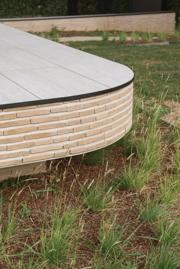 Le maître d’ouvrage a opté pour une construction traditionnelle, avec de grandes baies vitrées, une façade en brique et des détails soignés. Le choix de matériaux naturels confère une atmosphère chaleureuse à ce design contemporain, tandis que la stratification des volumes se traduit par un langage architectural horizontal affirmé.