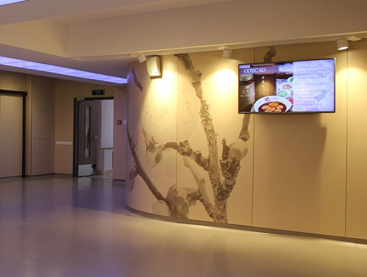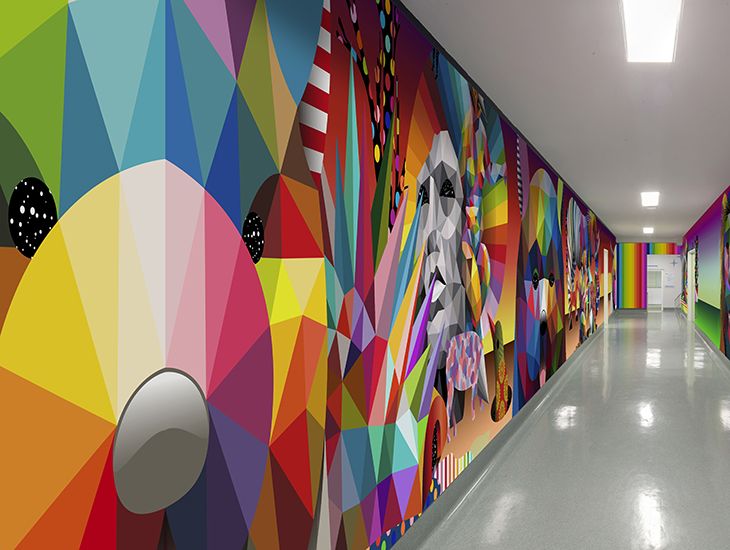 Les couloirs, restaurants et salles d’attente sont les meilleurs endroits où afficher des designs audacieux et des motifs denses, car les gens n’y restent pas trop longtemps. Donner à chaque espace une identité visuelle propre aide les gens à se repérer plus facilement, aussi des couleurs et des images fortes sont particulièrement utiles pour faciliter la circulation à travers un hôpital. Cependant, des couleurs trop intenses, des motifs et des graphismes trop contrastants peuvent être excessivement stimulants et doivent être utilisés avec circonspection.