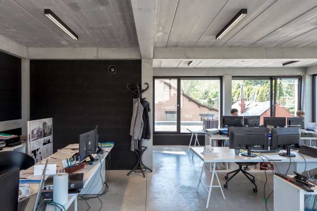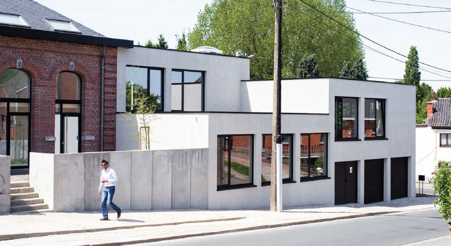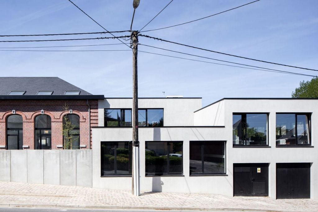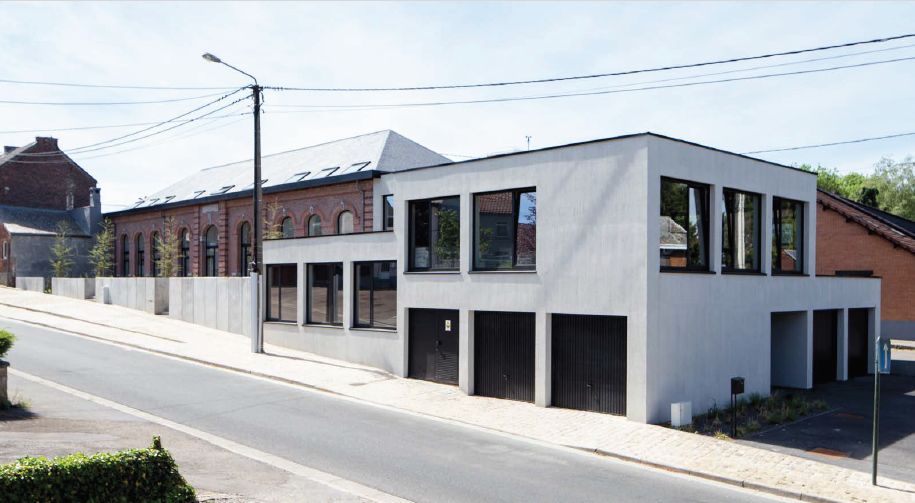 Le projet consiste en la réfection d’une ancienne école en logements couplée à la réalisation de nouveaux bureaux. L’ensemble des travaux constitue une véritable carte de visite pour les architectes. En effet, réhabilitation, rénovation et construction neuve se côtoient dans un projet global et cohérent souligné par l’emploi du béton. L’ancienne école est désormais occupée par quatre maisons unifamiliales qui bénéficient d’un espace extérieur dans la cour de récréation. En bordure de celle-ci, une palissade d’éléments en béton mène naturellement le regard vers le nouveau volume bâti au vocabulaire tranché et contemporain.