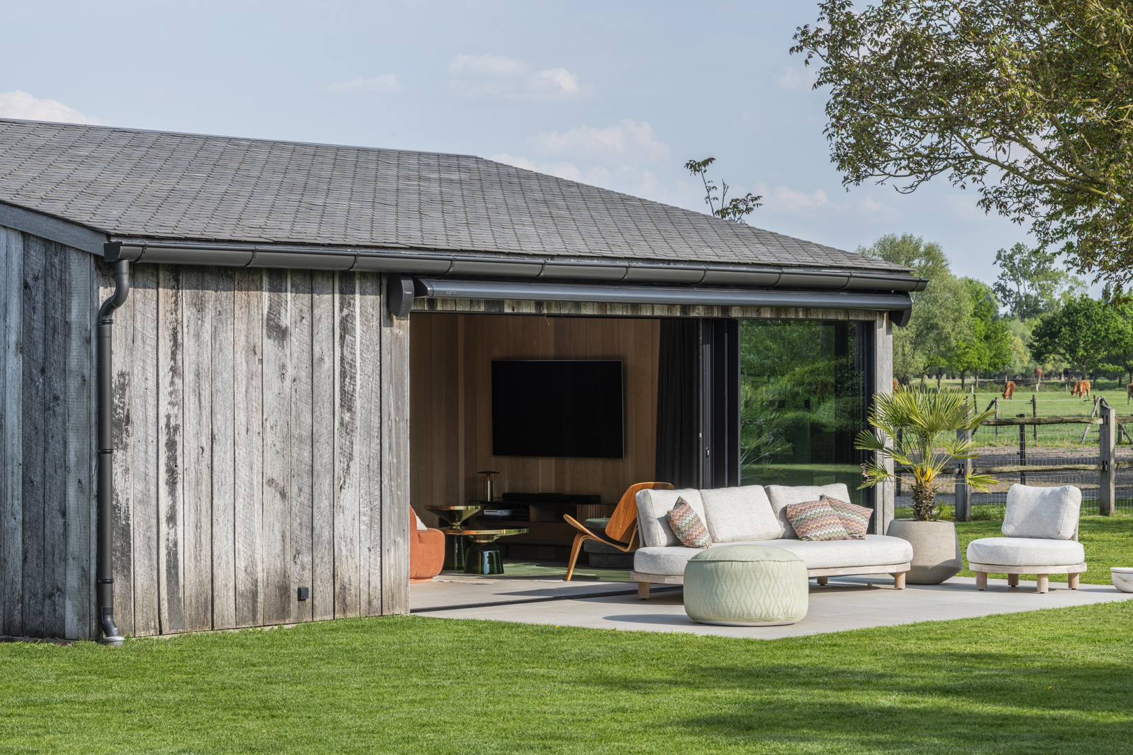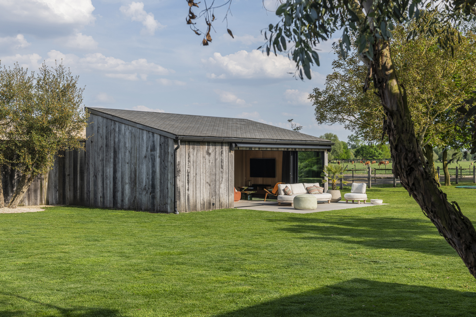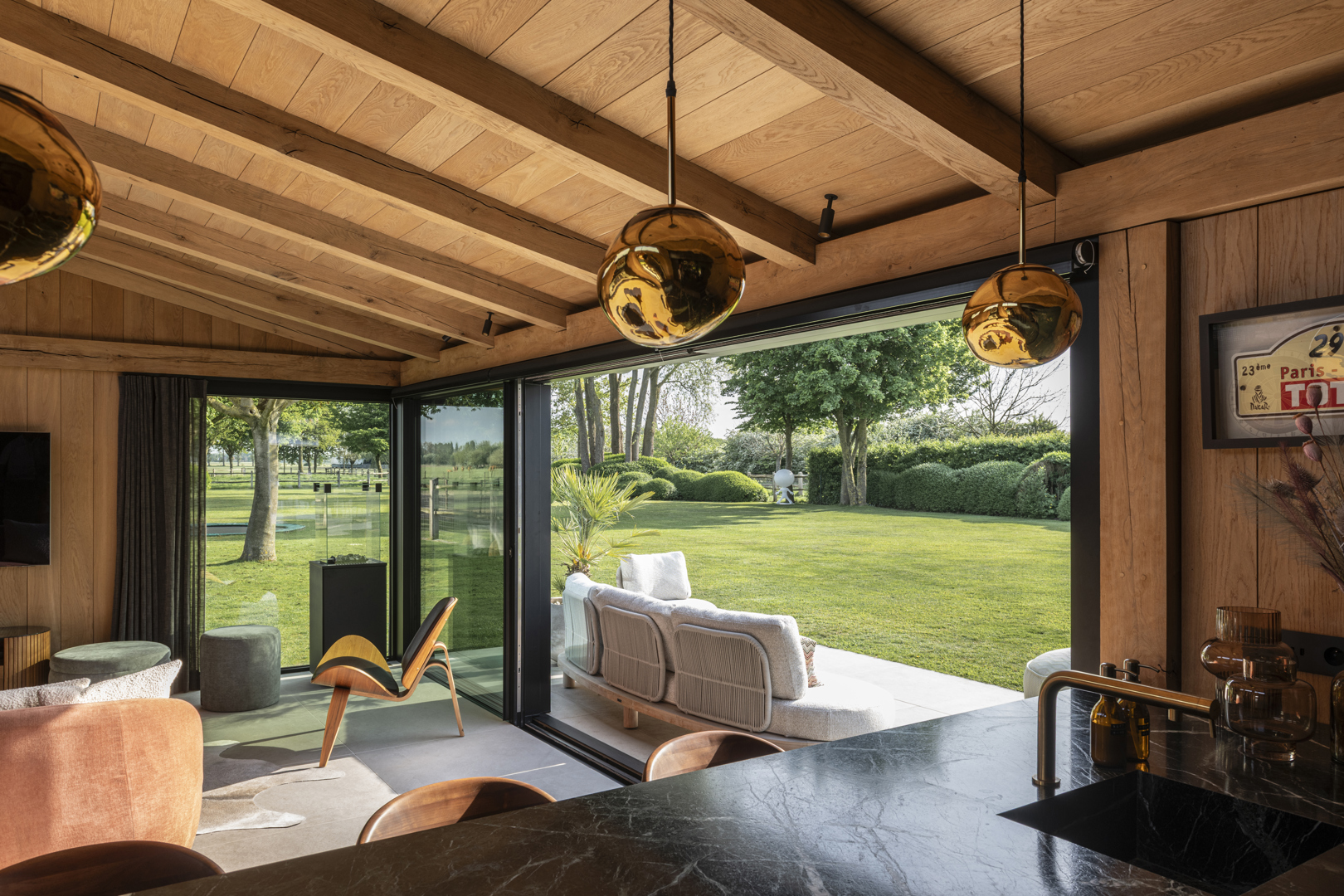 À l’intérieur, ce studio de jardin moderne respire l’élégance. L’aménagement associe charme intemporel et confort contemporain, avec un plafond composé de voliges en chêne massif apparentes et de poutres élégantes, en parfaite harmonie avec les murs entièrement habillés de chêne massif. Ces matériaux naturels apportent à l’espace une atmosphère chaleureuse et contribuent à une ambiance luxueuse. De larges baies vitrées en aluminium noir laissent entrer une lumière abondante et offrent une vue panoramique sur le jardin et les prairies environnantes, renforçant la sensation d’espace et de connexion avec la nature.