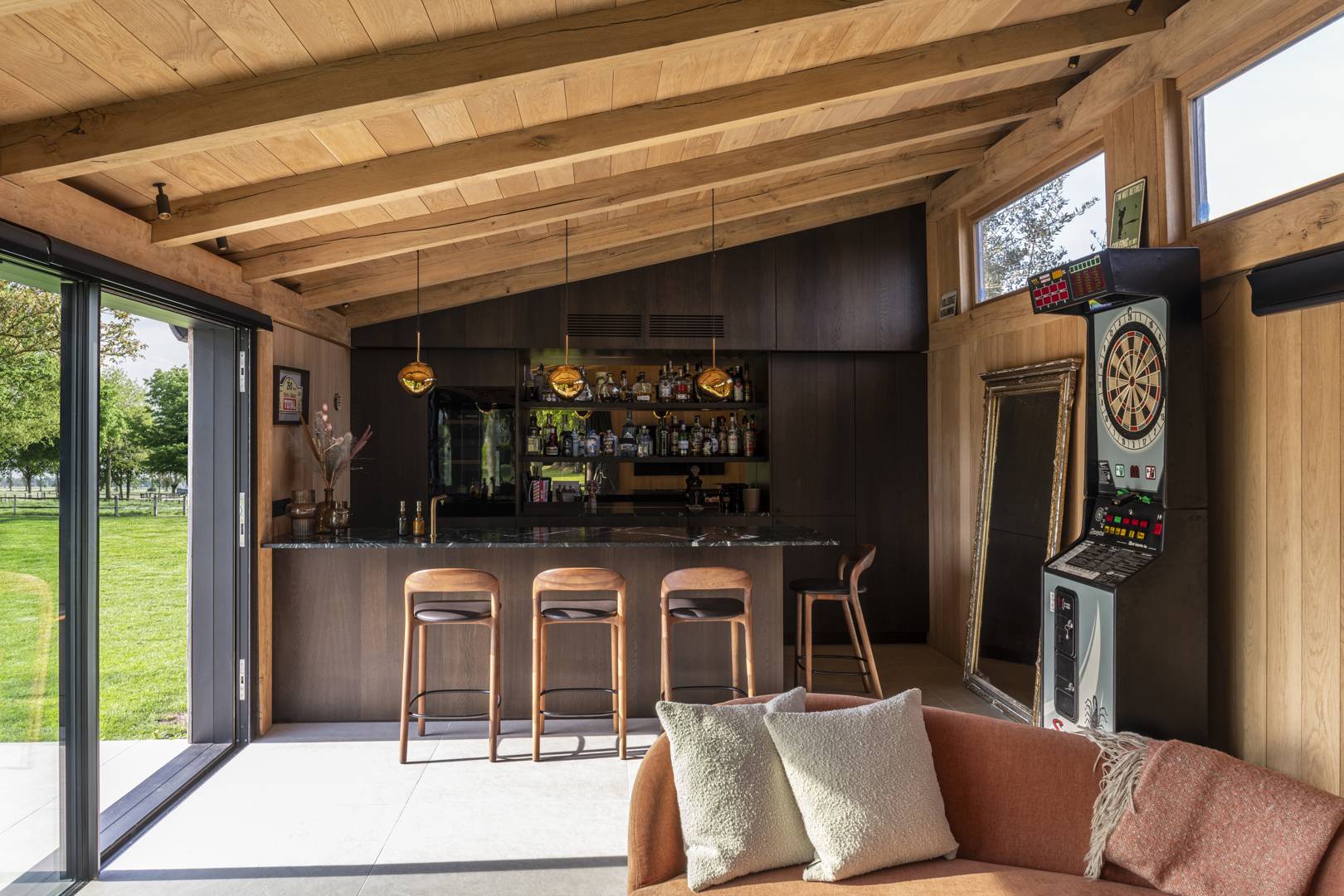 L’espace de vie supplémentaire a été aménagé avec un bar élégant et un salon contemporain, idéal pour recevoir des invités ou se détendre en toute tranquillité. À l’extérieur, la terrasse avec espace lounge invite elle aussi à la détente, dans un écrin de verdure. Ce studio de jardin en bois au look rustique est bien plus qu’un simple ajout esthétique à la maison : il s’agit d’un espace confortable et multifonctionnel, où il fait bon vivre toute l'année.