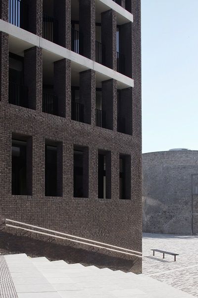 - Former deux îlots « fermés » dont l’identité est assurée par les continuités du bâti. A ce titre, un long bâtiment linéaire referme la ceinture initiée par les bâtiments voisins et réfère à l’échelle de l’îlot initial ; un petit bâtiment monolithique assurant le couturage des deux entités que représentent les Cours de Justice et le Théâtre du Manège.