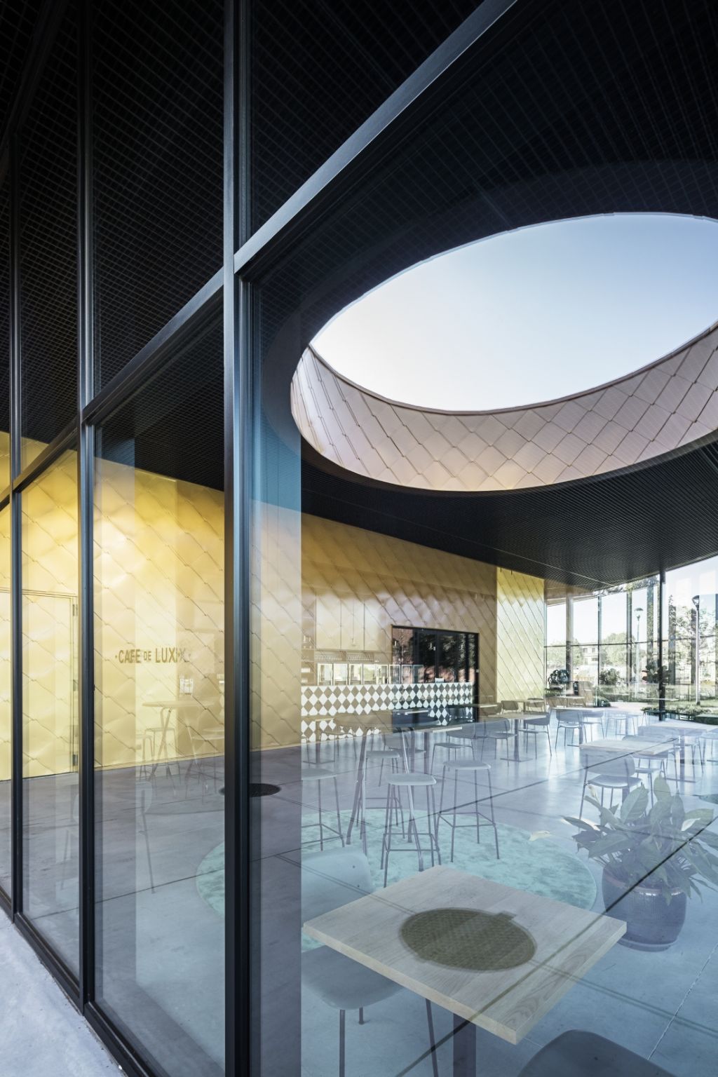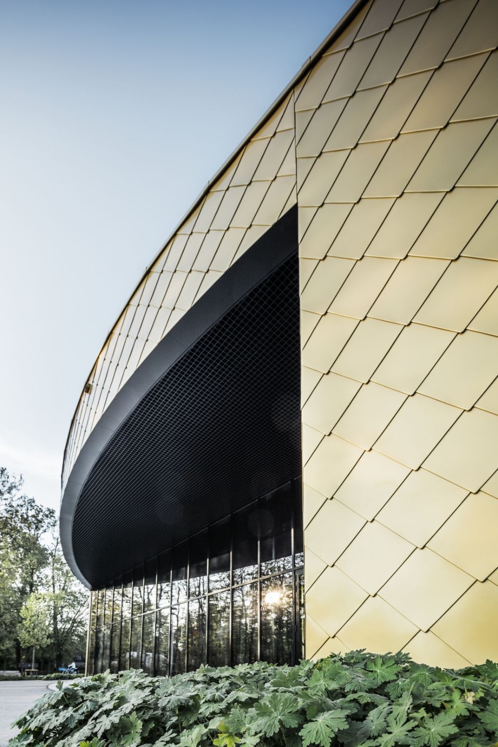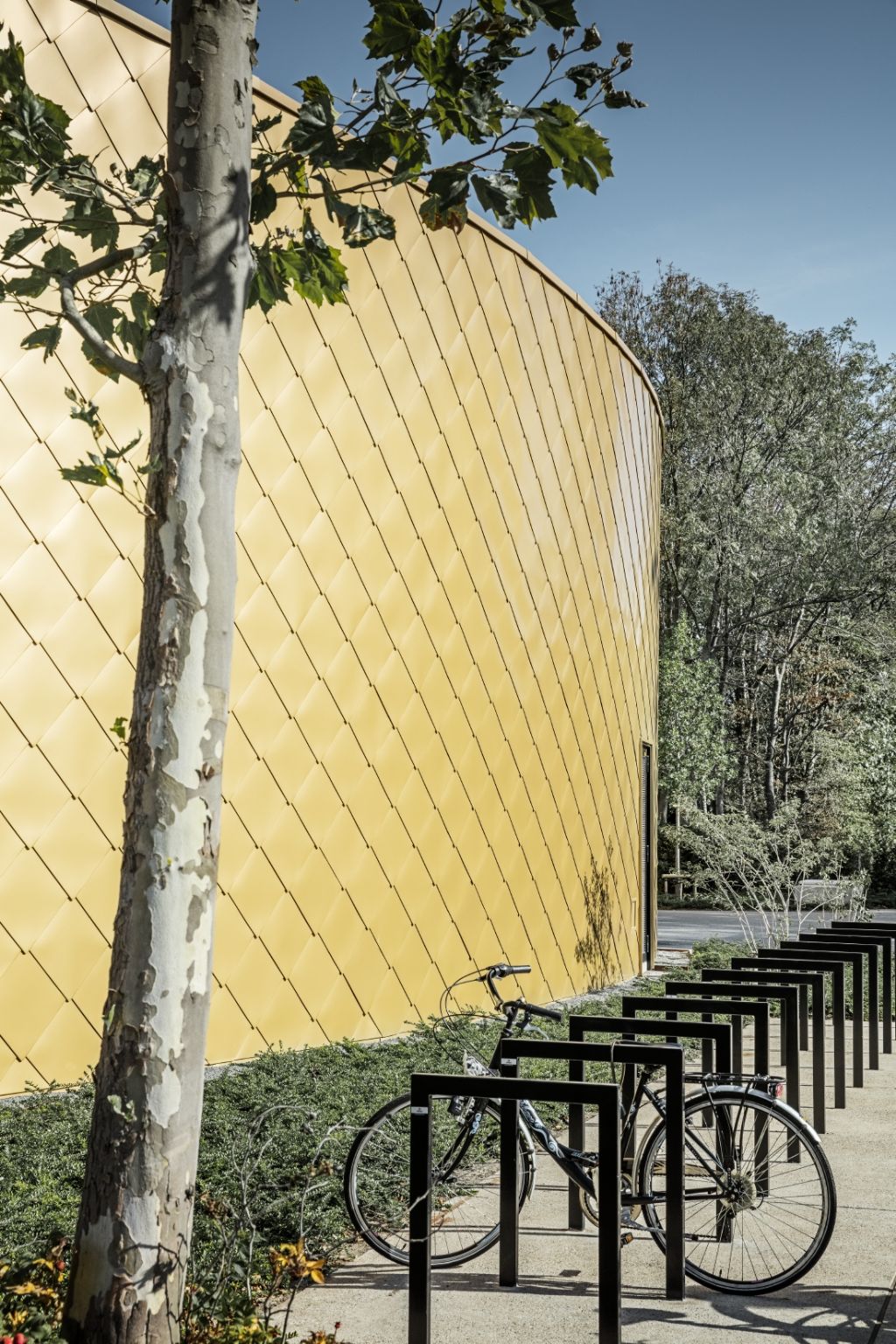 Ce nouveau centre culturel héberge notamment une salle des fêtes, une cuisine, des locaux techniques, des espaces de stockage, des vestiaires et un bar. Il se compose par ailleurs de deux corps de bâtiment — un disque cylindrique plat et un grand cube légèrement décentré posé sur ce disque. La façade en aluminium uniforme est ici et là interrompue par des surfaces de verre et des ouvertures qui permettent d’entrer dans le bâtiment ou de voir de l’extérieur ce qui se passe à l’intérieur.