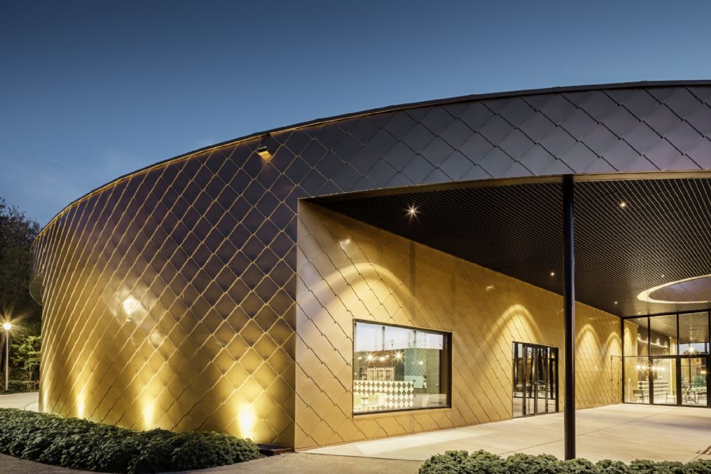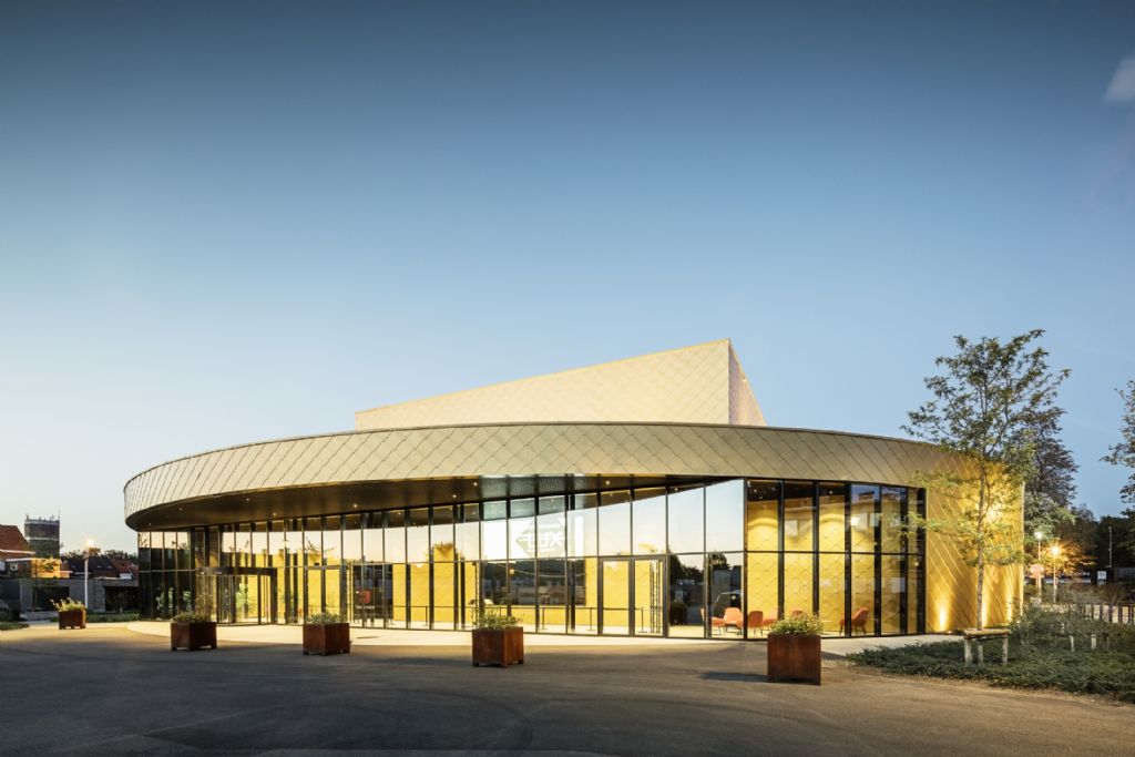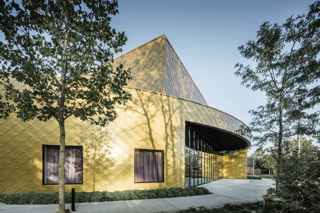 Au Polyvalente Cultureel Centrum de Kapellen, le losange a la part belle : ce motif est repris à la fois sur la façade extérieure et sur une partie des murs intérieurs dont les surfaces sont habillées de losanges grand format 44 × 44 de PREFA, couleur mayagold et P.10 noir. « Nous aimons jouer avec des éléments simples pour créer un design original », explique Toon Heyndrickx, un des trois associés du cabinet d’architecture met zicht op zee auquel a été confié la conception de cette construction neuve.