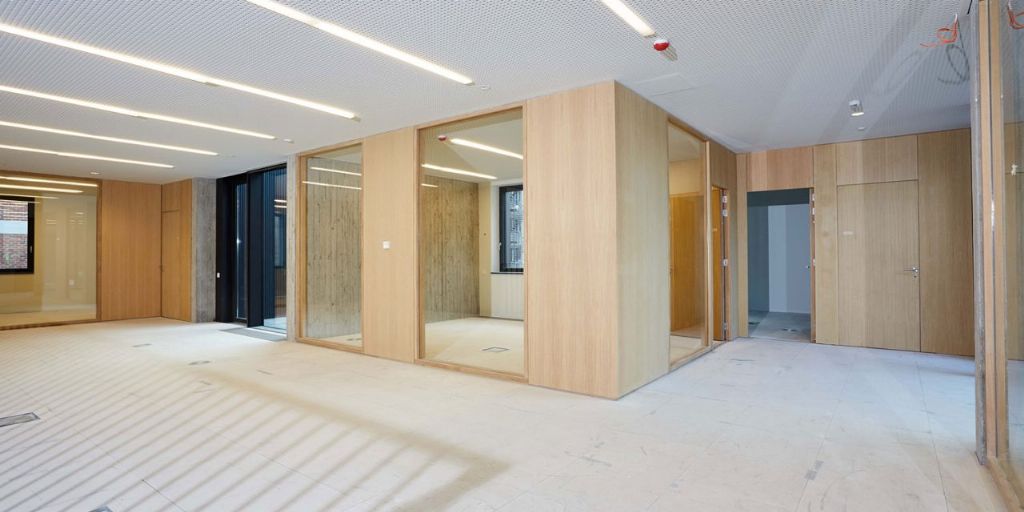 La présence de studios, de newsrooms, de bureaux et de nombreux locaux de montage audio et vidéo exigeaient des performances acoustiques exceptionnelles . Différents produits Knauf ont permis de satisfaire à ces contraintes élevées. Outre de la laine de roche Knauf RS 35 dans les ossatures métalliques, les cloisons ont ainsi été réalisées avec des plaques Silentboard à haute performance acoustique. Les plafonds ont quant à eux été réalisés avec un mélange de plaques standard, de plaques hydro et, surtout, de la fine fleur de l’isolation acoustique, à savoir la plaque perforée SoundDesign Cleaneo. La partie bardage comporte quant à elle de la laine de roche Knauf Cavity Slab. Tous ces produits ont été appliqués par l’entreprise de pose Inter-Plafond de Grimbergen.