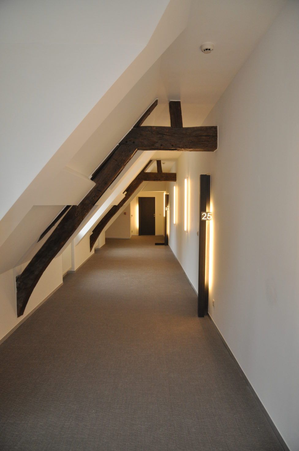 Les travaux de rénovation se sont déroulés en deux temps pendant cette décennie. Entre 2011 et 2013, le couvent, classé au patrimoine, a tout d’abord été aménagé en bureaux pour une centaine de personnes. « Cela concernait la réaffectation de tous les bâtiments des niveaux 0 et -1 autour du cloître en vue de l’installation des bureaux », explique-t-on à l’Atelier d’Architecture de Lavaux. Les 24 chambres d’hôtel crées pour le projet précédent ont été transformées en 12 appartements de standing et les abords ont été aménagés en parc et parking.