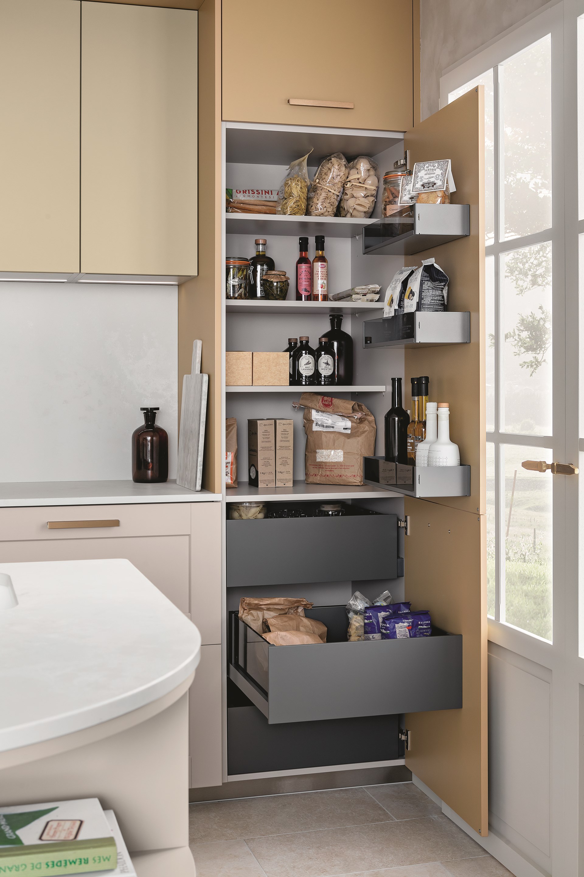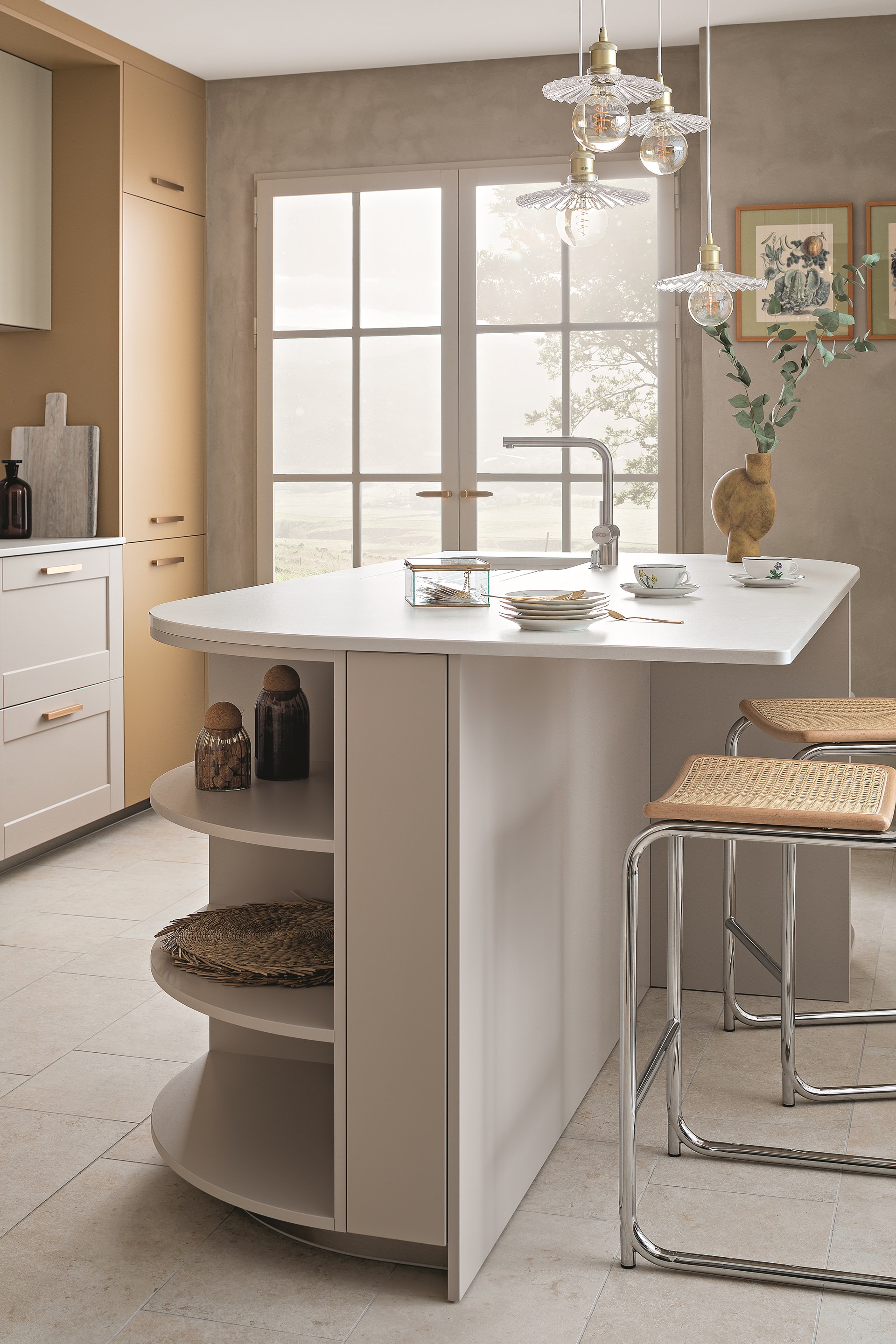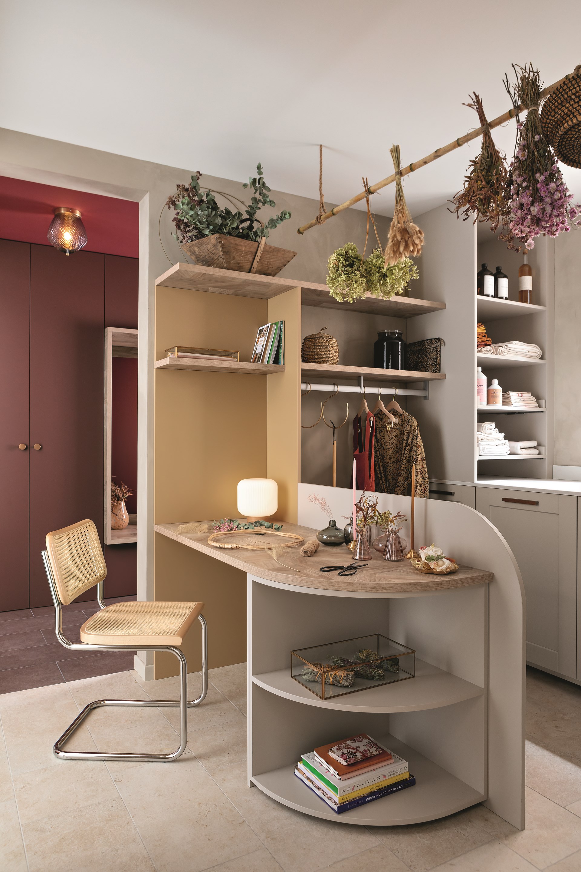 Dans les mêmes matériaux et teintes que la cuisine, la buanderie Bucolique apporte un nouveau souffle à la maison. Un espace fonctionnel qui cache bien son jeu ; à la fois cellier, penderie et atelier/bureau, cette pièce recèle de nombreux atouts grâce à l’optimisation des mètres carrés. La buanderie se distingue par son agencement intelligent, dissimulant l’électroménager derrière les façades et en créant une niche avec coulissants pour un accès aisé aux produits d’entretien ou linge de maison. Conçu pour anticiper l'humidité fréquente de cette pièce de vie, le design sur-mesure prend en compte chaque détail. Il suffit par exemple d'abaisser le mitigeur de l'évier, ajustable en position, pour ouvrir en grand les fenêtres (photo à l’appui). Comme dans l’entrée, le coin bureau se pare d’un plateau effet bois de chêne fragmenté, arrondi pour fluidifier le passage vers la buanderie. Sous le plan de travail, des niches ouvertes à la fois décoratives mais aussi fonctionnelles pour ranger boites et ustensiles.