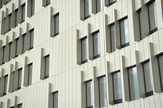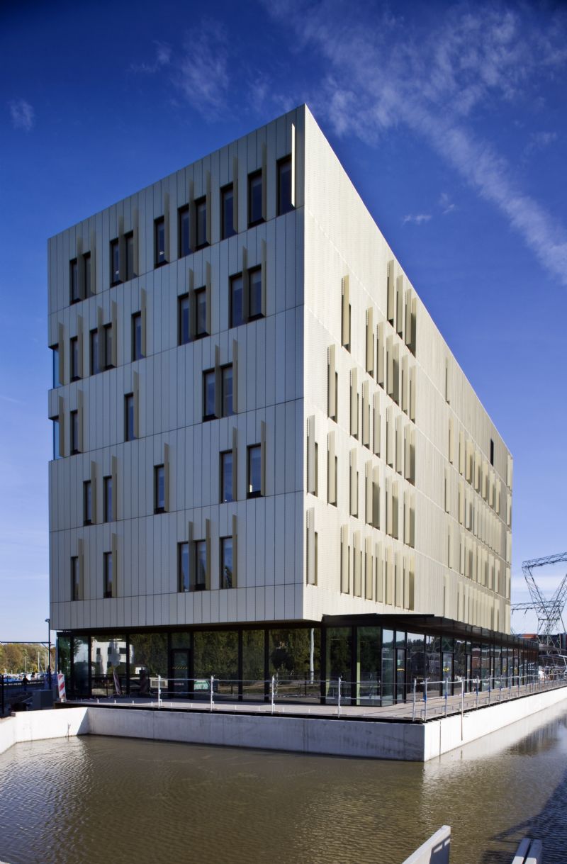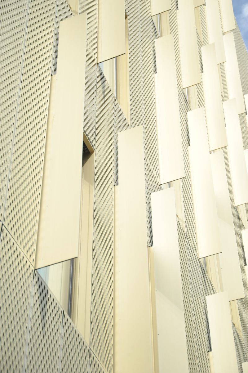 Niché dans ce contexte, le bâtiment principal propose un gabarit compact de six niveaux en forme de V. La faible épaisseur du bâtiment optimalise l'apport de lumière naturelle. L'enveloppe extérieure est réalisée en mur-rideau préfabriqué bois labellisé côté intérieur et tôle aluminium anodisée recyclé côté extérieur.