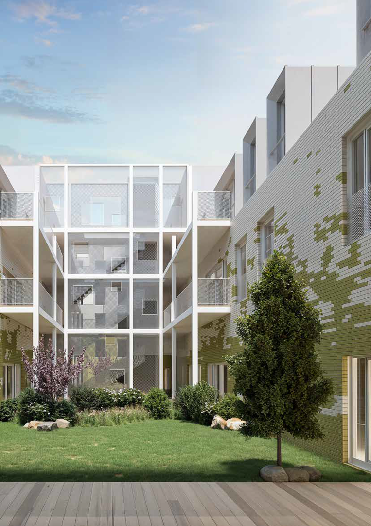 Ce patio paysager, pensé comme un petit parc urbain, offrira lumière naturelle et convivialité aux habitants.