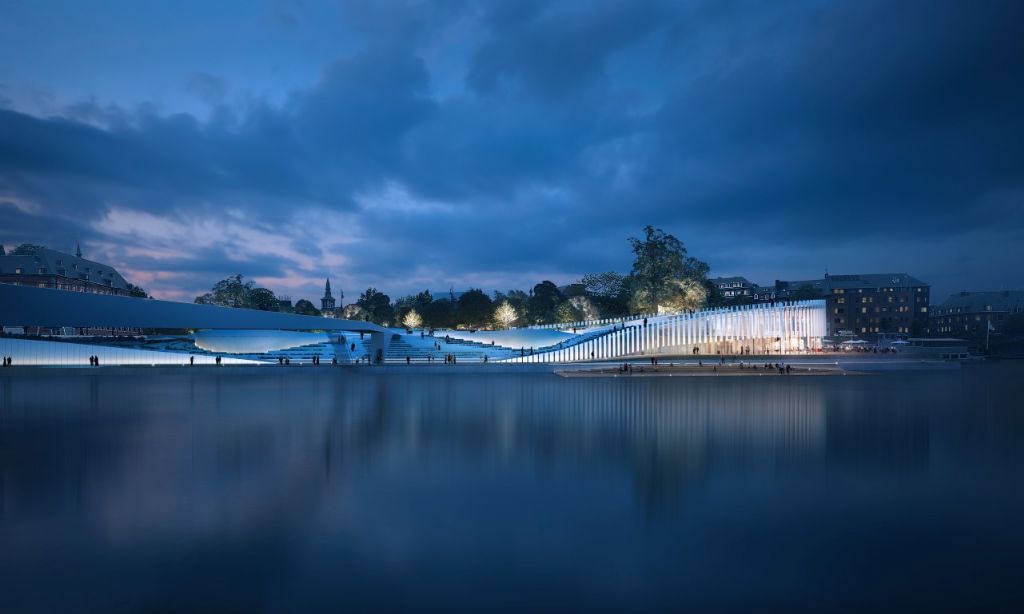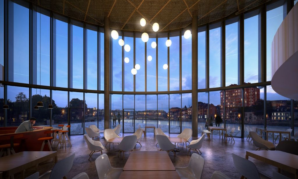 Le projet retenu est donc celui conçu par le bureau danois 3XN, associé pour l'occasion aux architectes namurois de BEE Architect. Dans son ensemble, il crée de nombreux points de vue depuis l’esplanade et le bâtiment vers l’eau. Sa configuration permet également un contact direct avec le fleuve, grâce à sa grande terrasse aménagée à la pointe du confluent. Toute la façade « Meuse » du projet est ouverte sur le fleuve : un beau jeu de gradins invite à la redécouverte de la Meuse, de son rythme, de sa vie au gré des bateaux et des événements qui l’animent. A la pointe du Grognon, la façade du Port numérique est vitrée sur toute sa hauteur jusqu’au niveau des quais. De l’intérieur du bâtiment, cette transparence offre une vue imprenable sur le confluent et sur les quais de la ville. Au pied de cette façade, la terrasse permet de s’arrêter, le temps d’un café ou d’une conversation passionnée, face au magnifique paysage.
